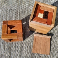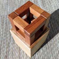 The puzzle is a set similar to the Penultimate Burr with multiple problems to be solved. The set consists of a 4×4×4 cage with a 2×2 opening on each face and 14 non-planar penta/tetracubes. The objective is to fill the cage with four of the pentacubes and three tetracubes to complete a 4×4 cube. A jig is provided for testing possible solutions outside the cage, as well as a box which doubles as a display plinth for the solved puzzle. This is a difficult puzzle, with two assemblies having a unique sixteen move solution! 63 copies, each signed and dated, are available for this release. This puzzle is shipped disassembled." |