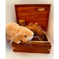 I made a box to house it and it ended up fairly large (6”x7”x4”) so please keep that in mind. It’s made from Padauk with a Black Limba Sleeve. Slipfeathers are Holly.