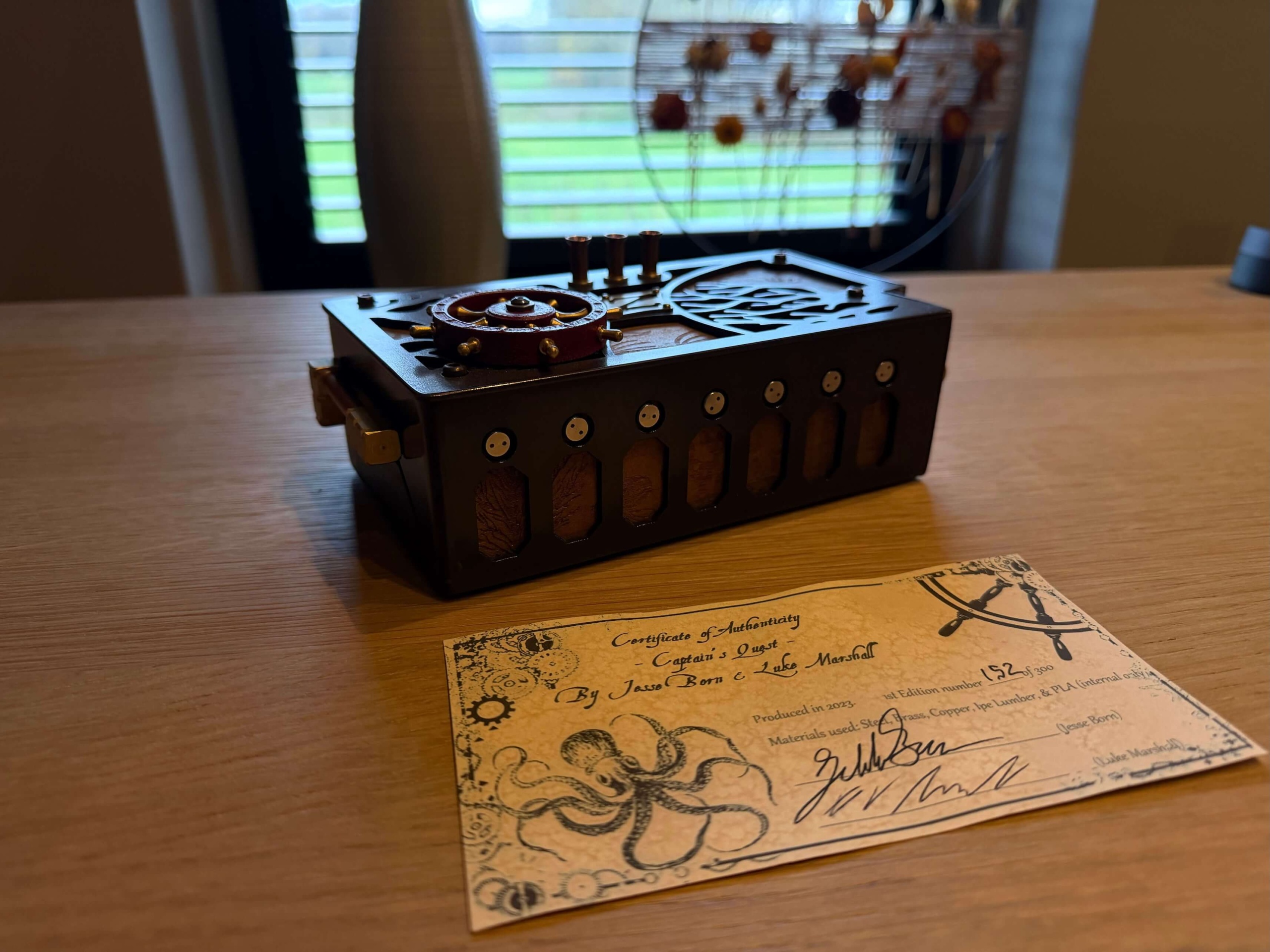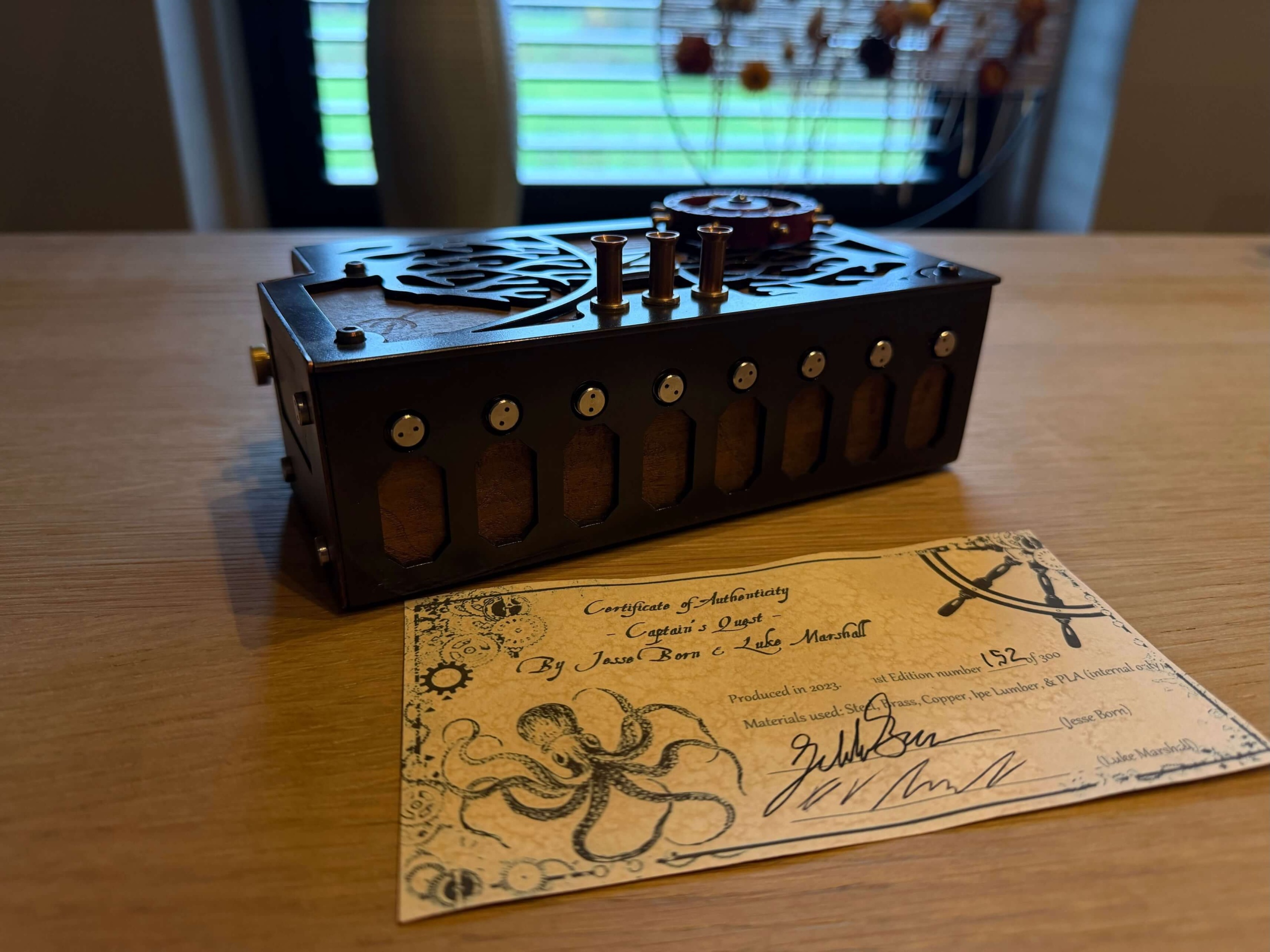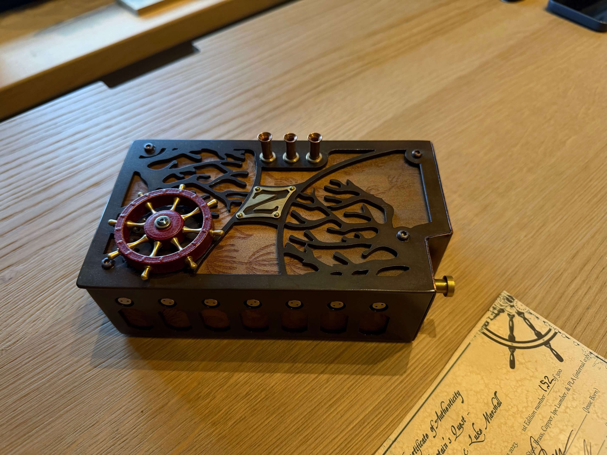 This Puzzle is a nautical theme sequential discovery puzzle made from Steel, Brass, Copper, Ipe Lumber, and PLA (internal only).