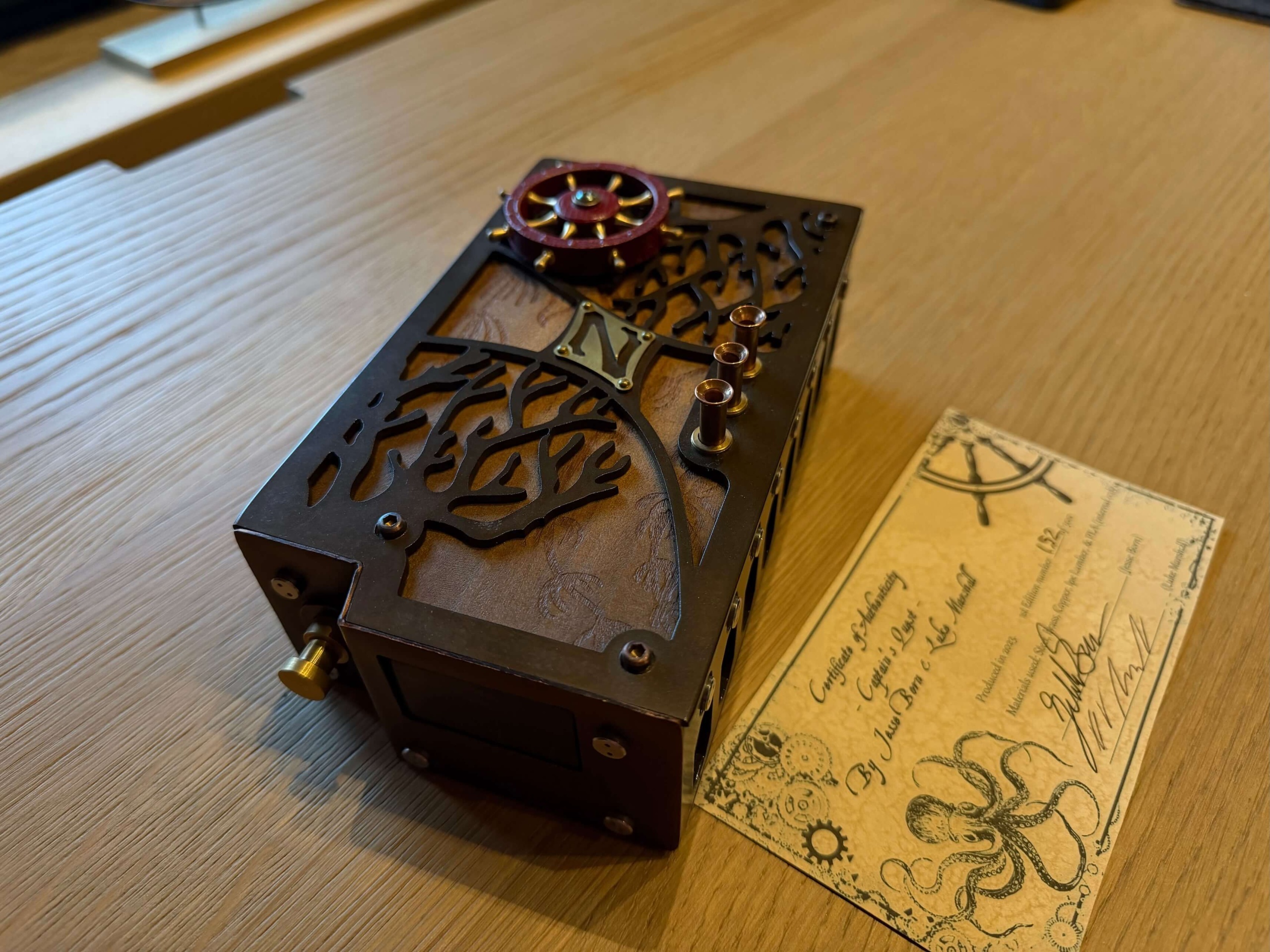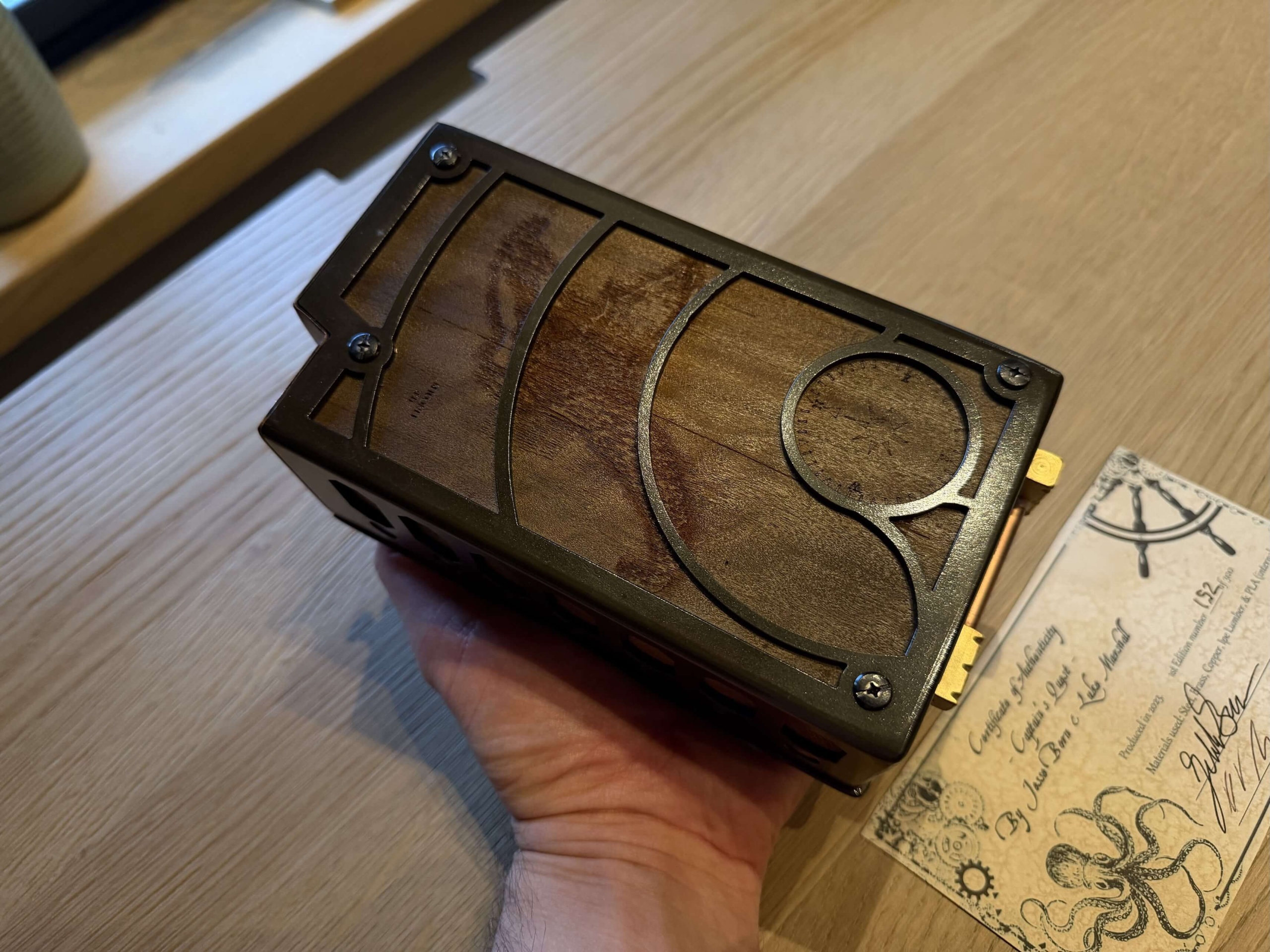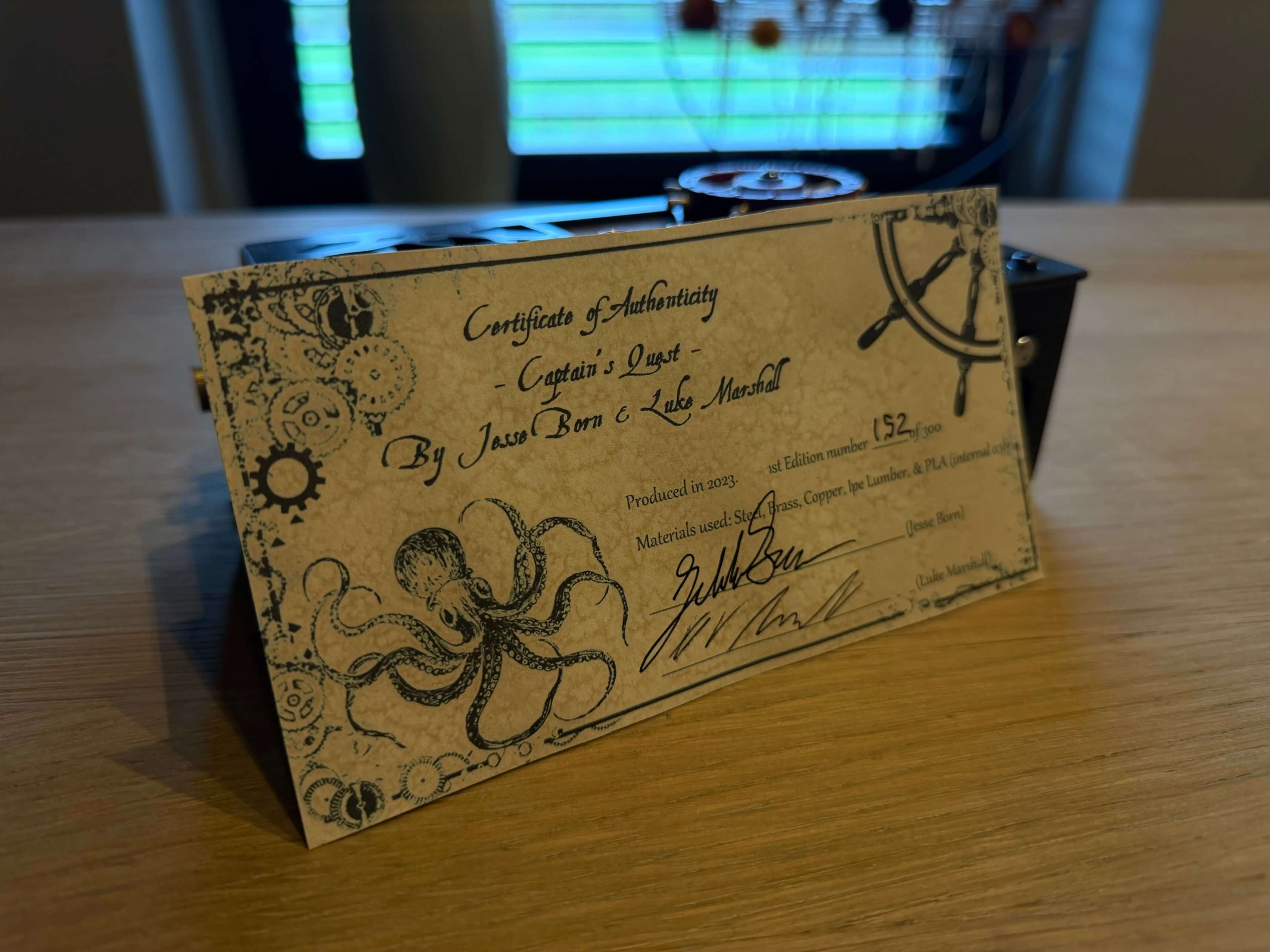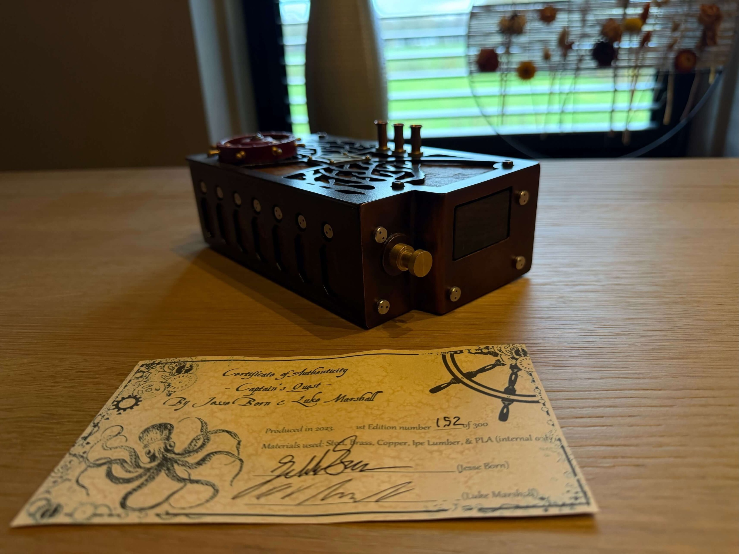 This Puzzle is a nautical theme sequential discovery puzzle made from Steel, Brass, Copper, Ipe Lumber, and PLA (internal only).