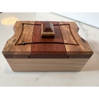 The top layer of the puzzle, including the knob, is made of Jarrah and sap wood of Bubinga, both of which have very distinctive textures. American Rock Maple was used for the main part of the box frame and Golden Sassafras for the maze area, which has good workability with a CNC router.