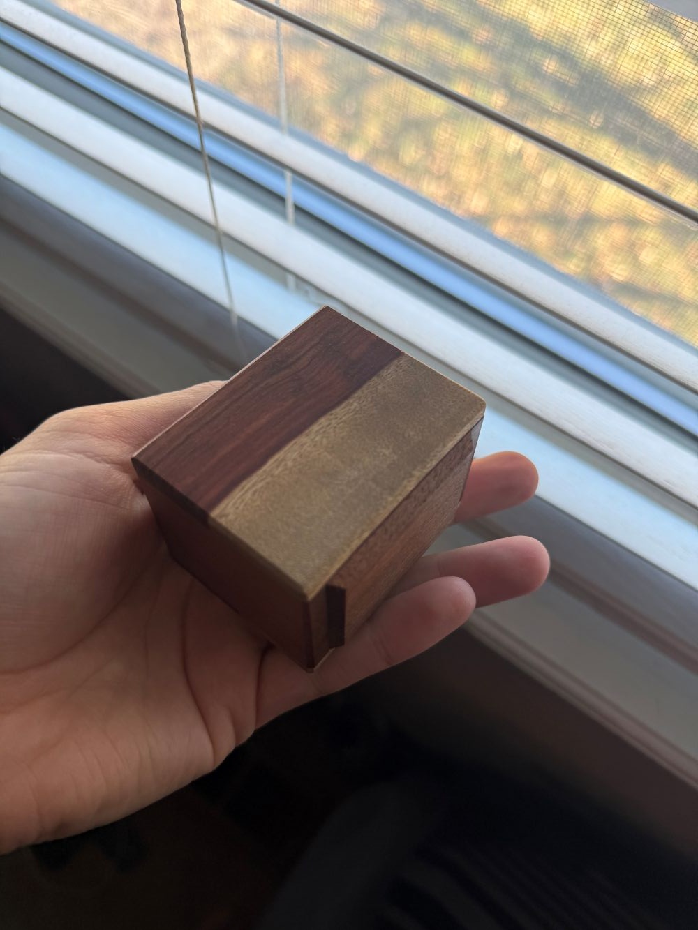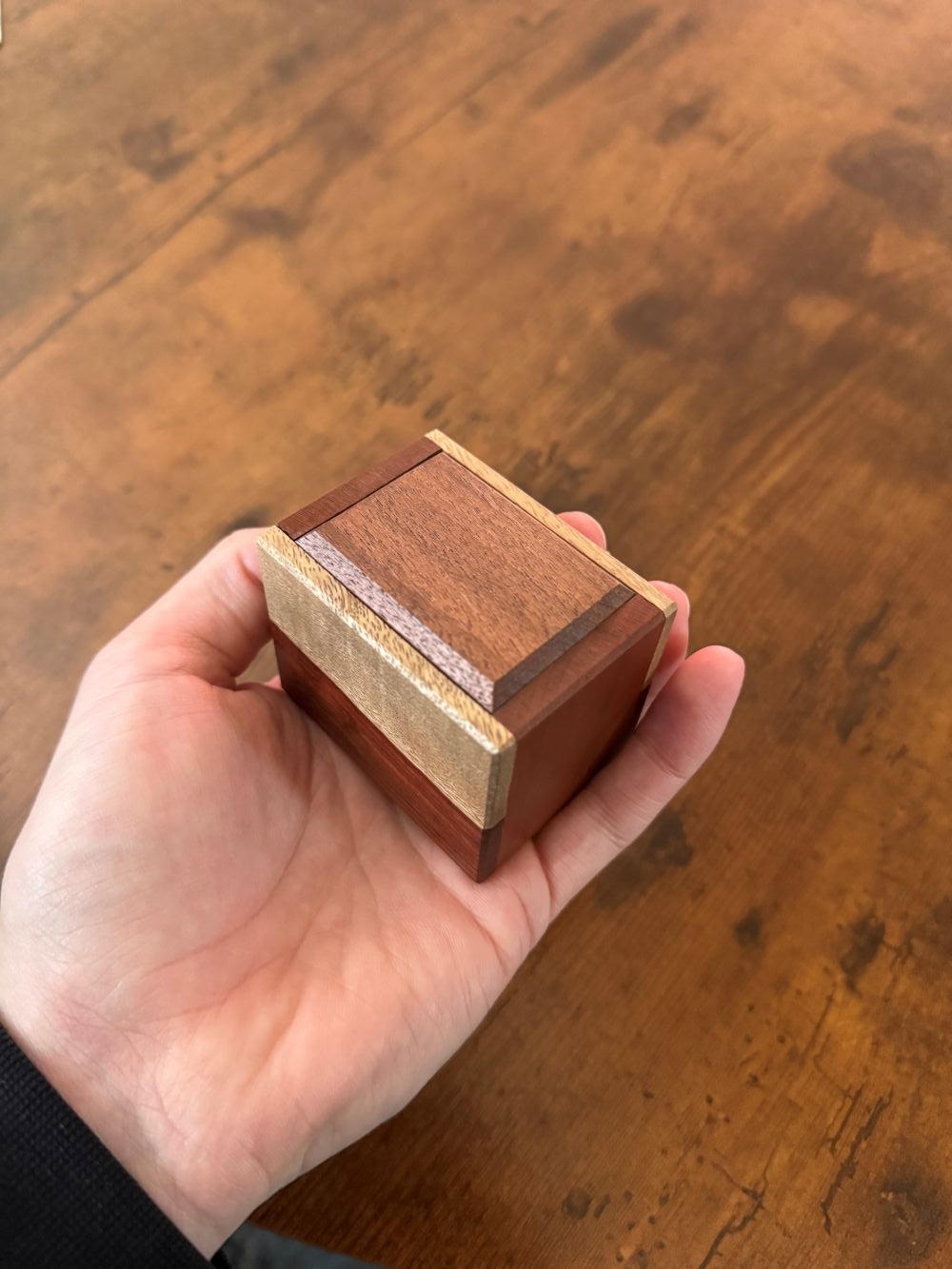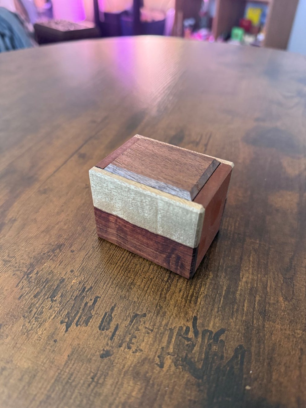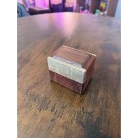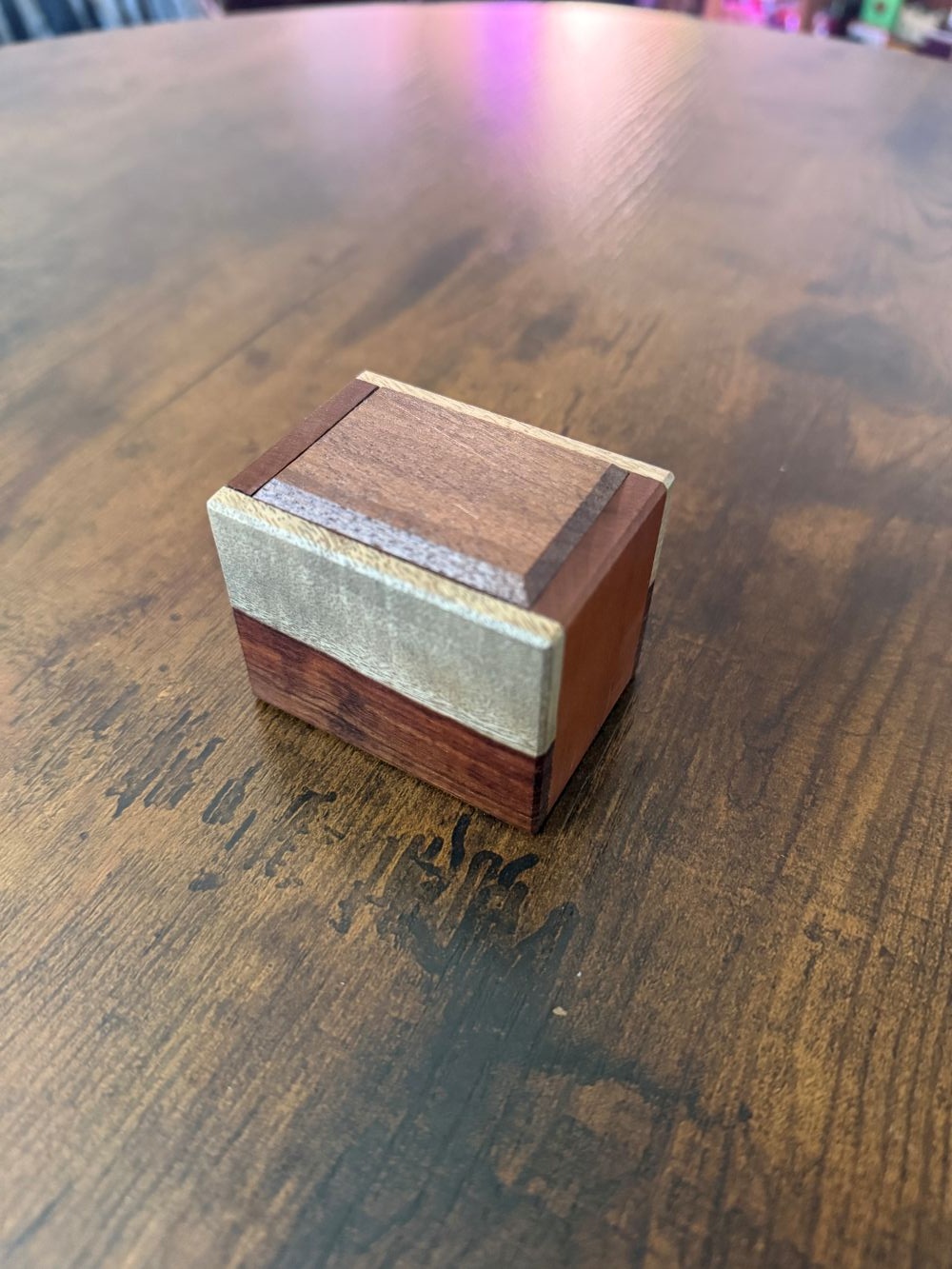 Constructed from walnut, maple, cherry, and an exotic (or burl) wood used for front and back of the puzzle.