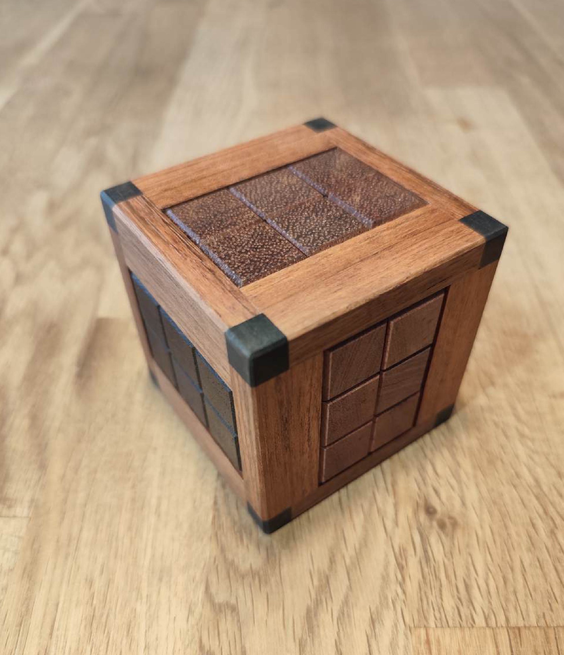 The Puzzle is in great condition and has good fit, not too loose, not too tight. It has no damage and was stored under controlled humidity conditions, no smoking or animal contact. But be aware, this puzzle is hard :)I am the original buyer from Pelikan. Buyer to pay shipping, please wait until auction end to determine shipping costs together.Orignal Description from Pelikan:It measures 84 mm x 84 mm x 84 mm. Material: Maple, American Walnut and brass pins. Difficulty: 75 (58.1.5.3.3.1.2)