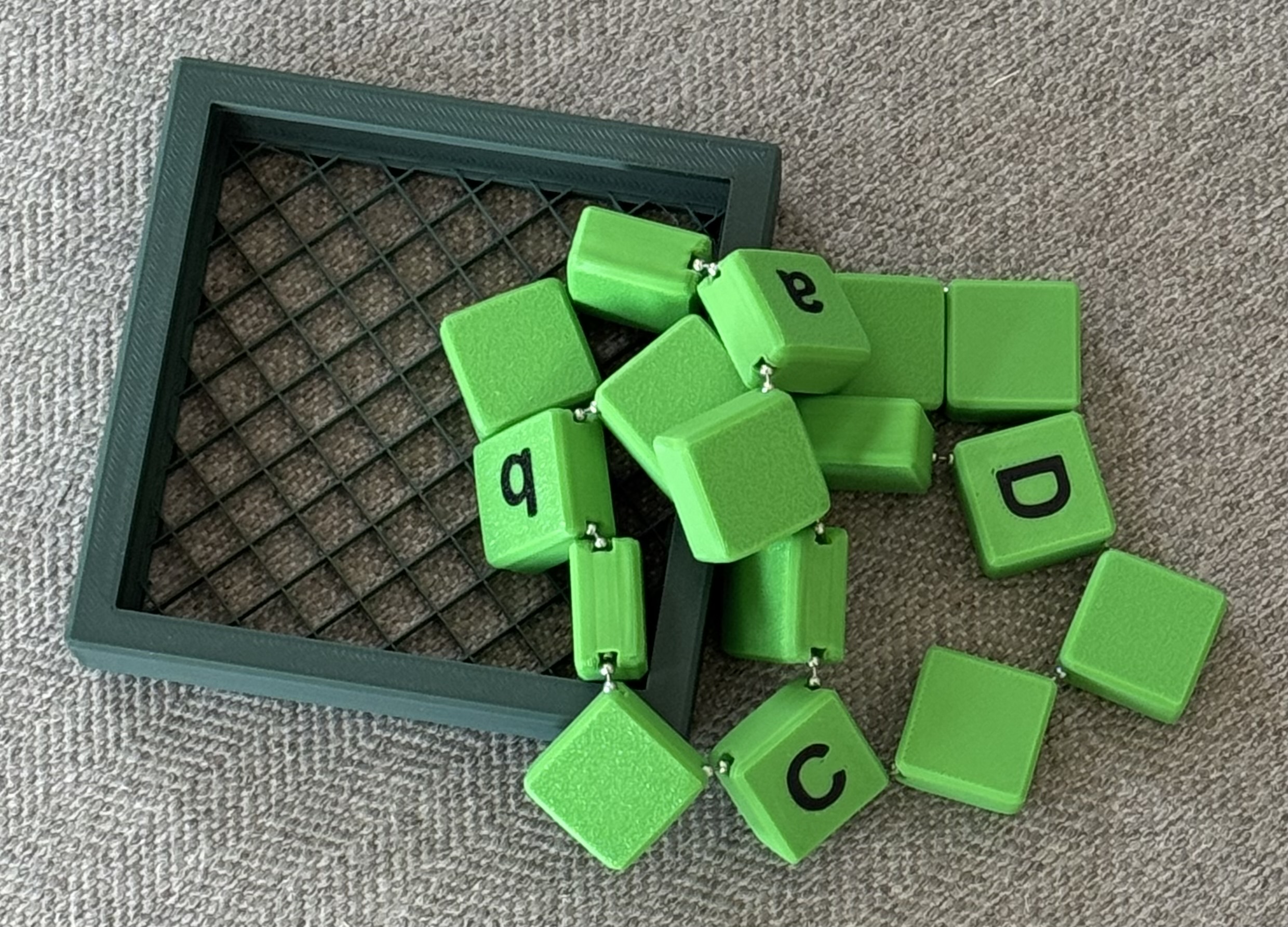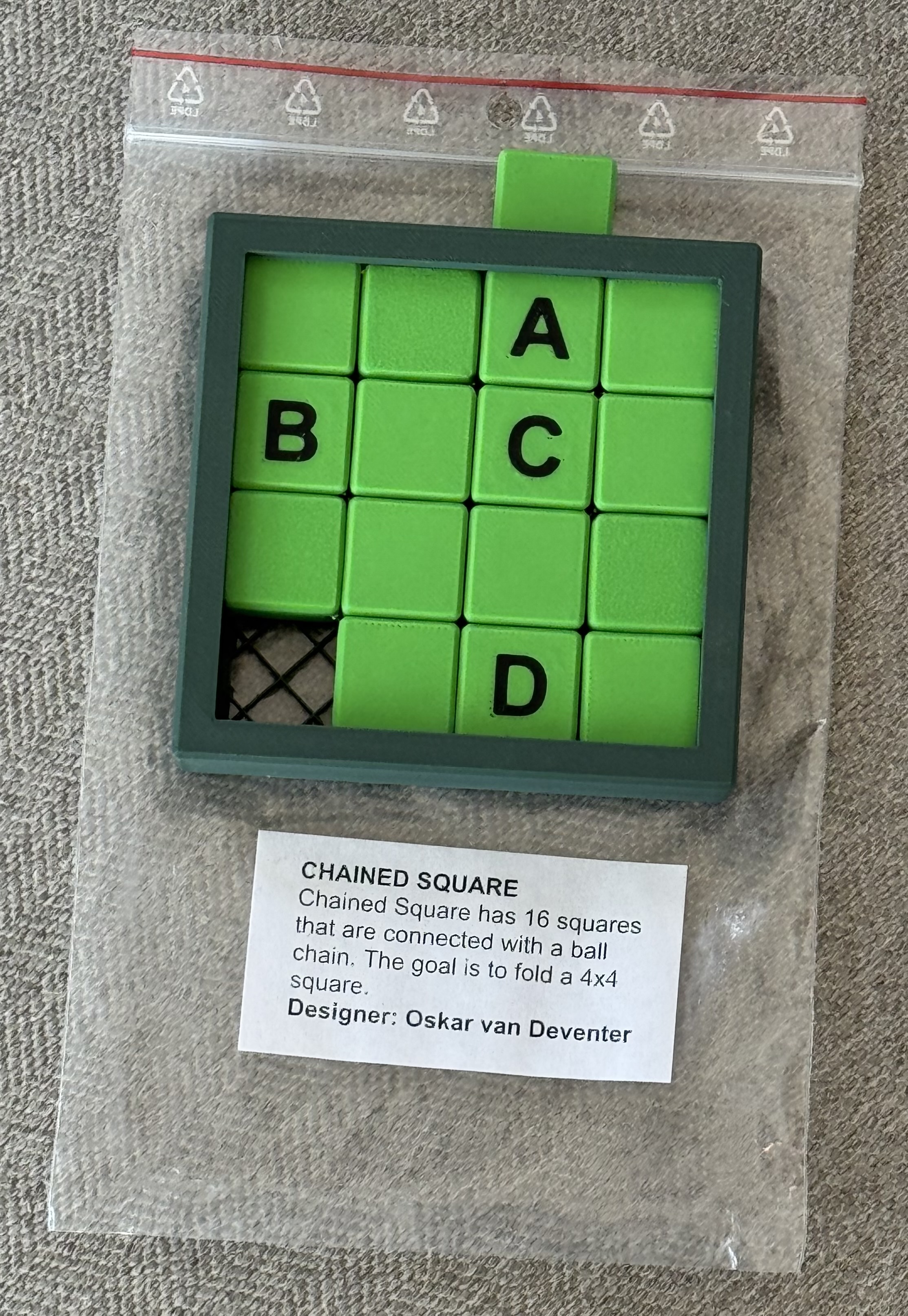 Object:  arrange the chained squares into a 4x4 larger square to fit within the tray.  The letters merely provide a reference so you can show the solution once solved.