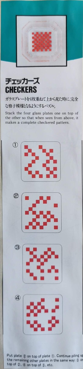 Stack the four glass plates one on top of each other so that when seen from above it makes a complete checkered pattern.