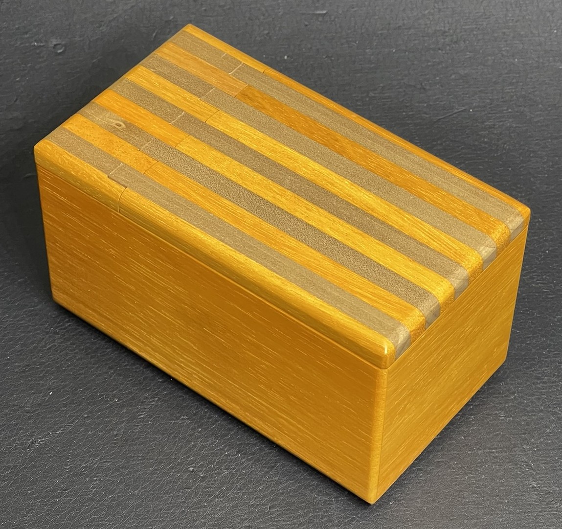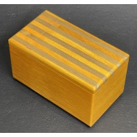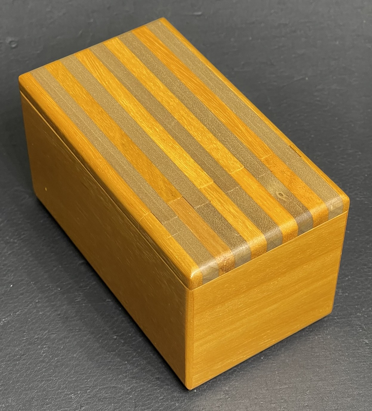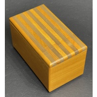 Puzzle box is in excellent condition.  Original packaging and paperwork are included.Per the Karakuri website:SkyscraperscraftsmanOsamu KashoITEMOS-19Created3/2020Size(box body)100x115x73mmSize(storage part)75x57x45mmMaterialJapanese walnut, wendge, chanchin, kmaple, oak, cherryFacebookTwitter共有This work was designed for an exhibition with the theme, “GO”. Five buildings are standing on the top of the box. The height of the buildings are adjustable. What is the pattern of the top board?...