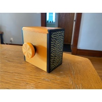 Description from website:The name comes from a movement in the puzzle that needs to be discovered in order to find a compartment.Constructed from walnut, maple, cherry, and an exotic (or burl) wood used for front and back of the puzzle.The mechanism can be solved without the use of external tools. No banging, forcing, or spinning allowed. Once fully open, the mechanics can be viewed and in the palm of your hand.4.5x3.25x3Buyer to pay shipping calculated after auction ends.