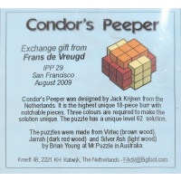 Jack Krijnen has invented a number of different 18 piece burrs in the past few years but this one stood out from the others. The puzzle has 29467 possible assemblies.