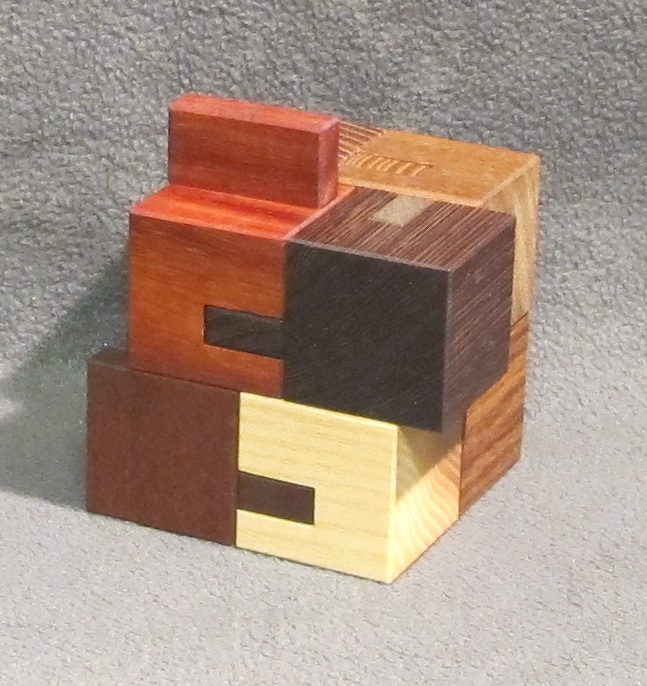 This is a beautiful made puzzle by Brian Menold. There are three cubes which stacked on each other will provide 13 visible surfaces. The challenge is to arrange the cubes in such a way that there’s one continuous line across all these 13 surfaces. The way Brian made the cubes must have been very time consuming! Every line is a solid piece of wood surrounded by the lighter wood. With the lacquer finish it looks stunning! As for the puzzle...it’s pretty hard!Shipping to be determined aft...