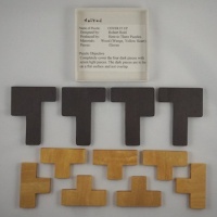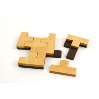 Goal: Arrange the four dark wood pieces so that the seven light wood pieces cover all of the dark wood. The dark pieces are to lie flat and not overlap.