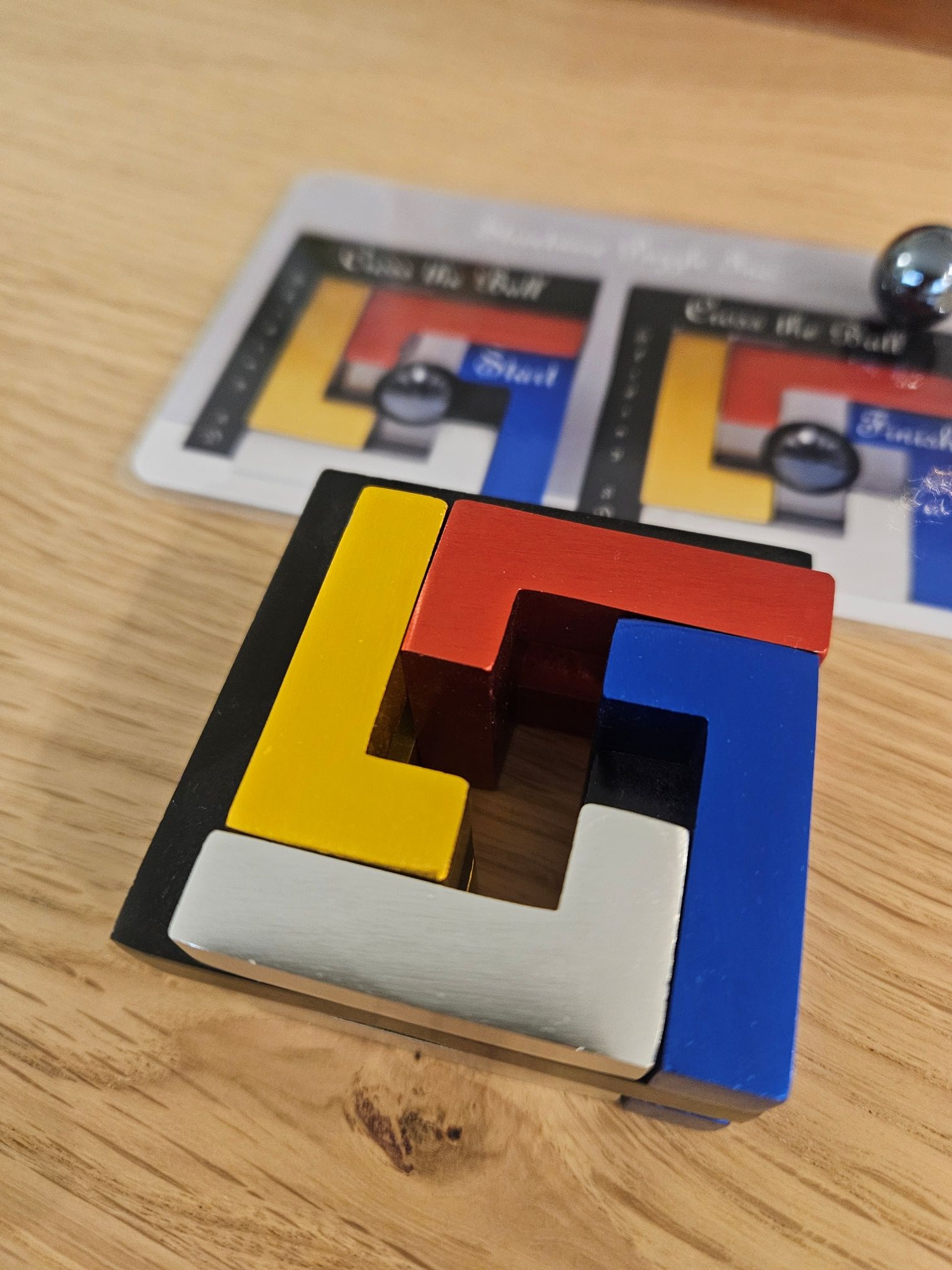 Description:The goal is to take apart the ball. This is an original puzzle designed and made by Marcel Gillen himself long time ago. The original thing about this puzzle is that it's composed of 3 different material: MDS, aluminium and plastic.4 steps to solve the puzzle (but it always depend on how you count the steps)The puzzle will be shipped with the base wrapped separately from the metal tube and separately from the cage with the ball inside.Payment : PayPal (F&F preferred or fees to be pai...