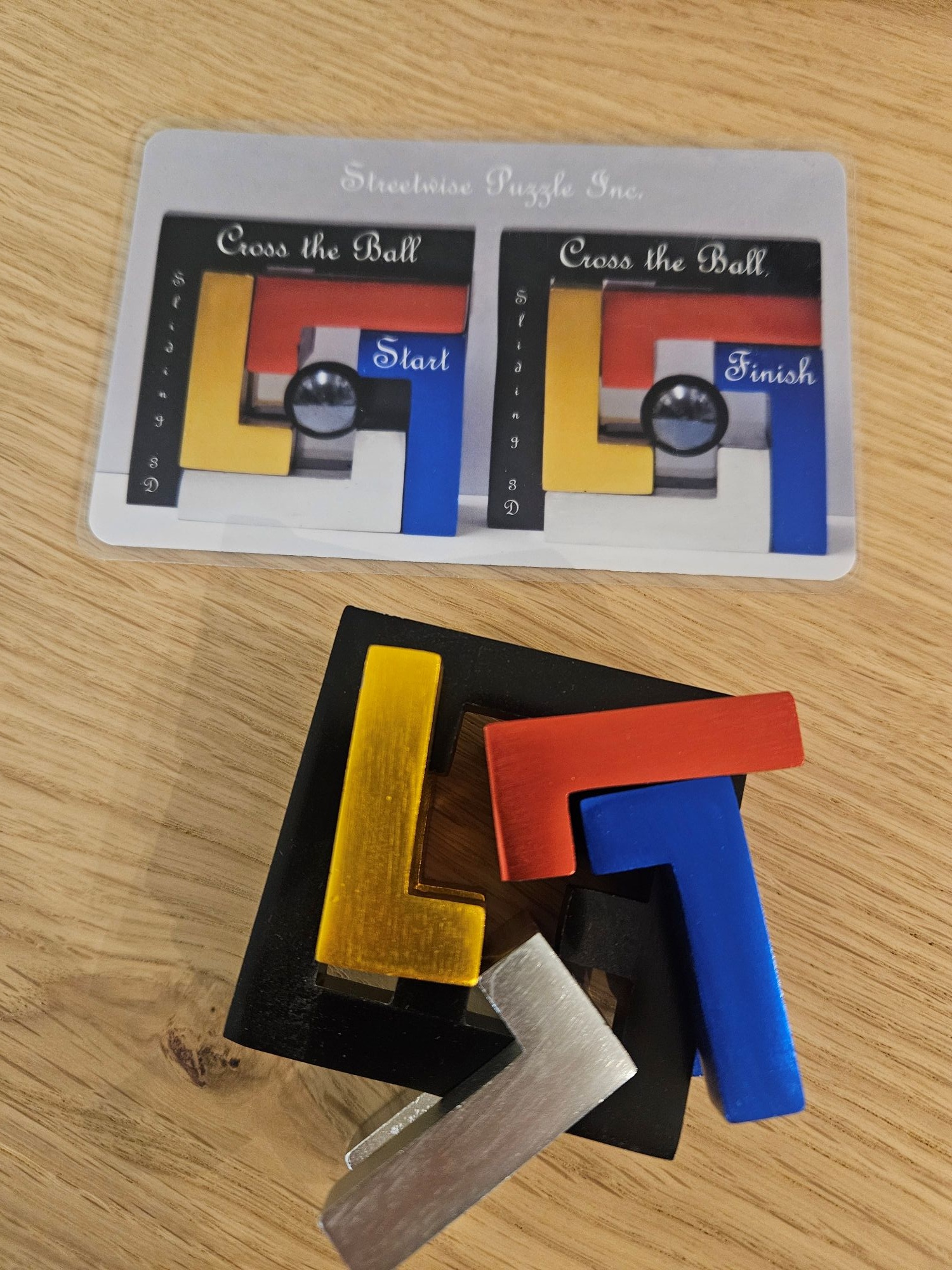 The goal is shown in the instruction card but the pictures help understand better the puzzles. There are 4 metal pieces dancing in a black metal structure.