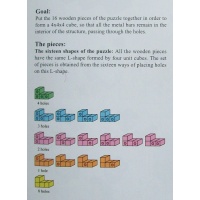 The sixteen shapes of the puzzle: All the wooden pieces have the same L-shape formed by four unit cubes. The set of pieces is obtained from the sixteen ways of placing holes on this L-shape.
