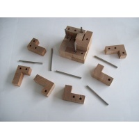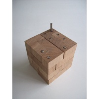 Put the 16 wooden pieces of the puzzle together in order to form a 4x4x4 cube, so that all the metal bars remain in the interior of the structure, passing through the holes.