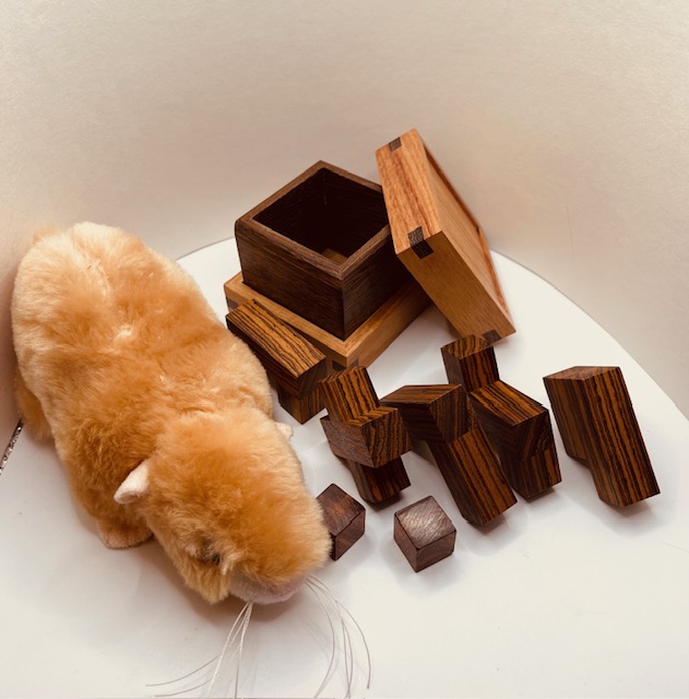 I’m offering up this fun design by Alexander that was beautifully crafted by Pelikan.Kevin Sadler wrote about it:“Do you like the Soma cube and its associated challenges? If so then you will love the Edition of Additions! Alexander has branched out into a different genre of puzzles to his usual packing or interlocking puzzles and has created something perfect for new and old puzzlers alike. This is absolutely stunning made with Bubinga pieces and an Oak box which has been beautifully made (...