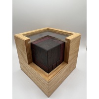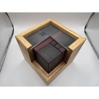 “This startlingly gorgeous creation by Frederic Boucher is one of the picks of the bunch this release. Not only is it stunning, it is also a very very challenging fun design. Frederic has an amazing and rather warped mind. He has collaborated with several of the very best craftsmen in the world to get his designs to the masses as well as makes some limited runs of his puzzles himself. I am delighted that he was able to find someone willing to make such a complex puzzle available. This beautiful creation has been produced by Pelikan from Wenge, Pink Oak, Purpleheart and acrylic. There are 8 cubes with sticks of 2 different lengths which, when assembled together, form a 2×2 cube. I have to admit that just making the cube (albeit with some holes) is a massive undertaking and really quite fun – its a sort of 3D jigsaw that has to slide together sequentially in order. However, the real challenge is to pack that cube inside the box so that no holes are visible from outside (unique solution).