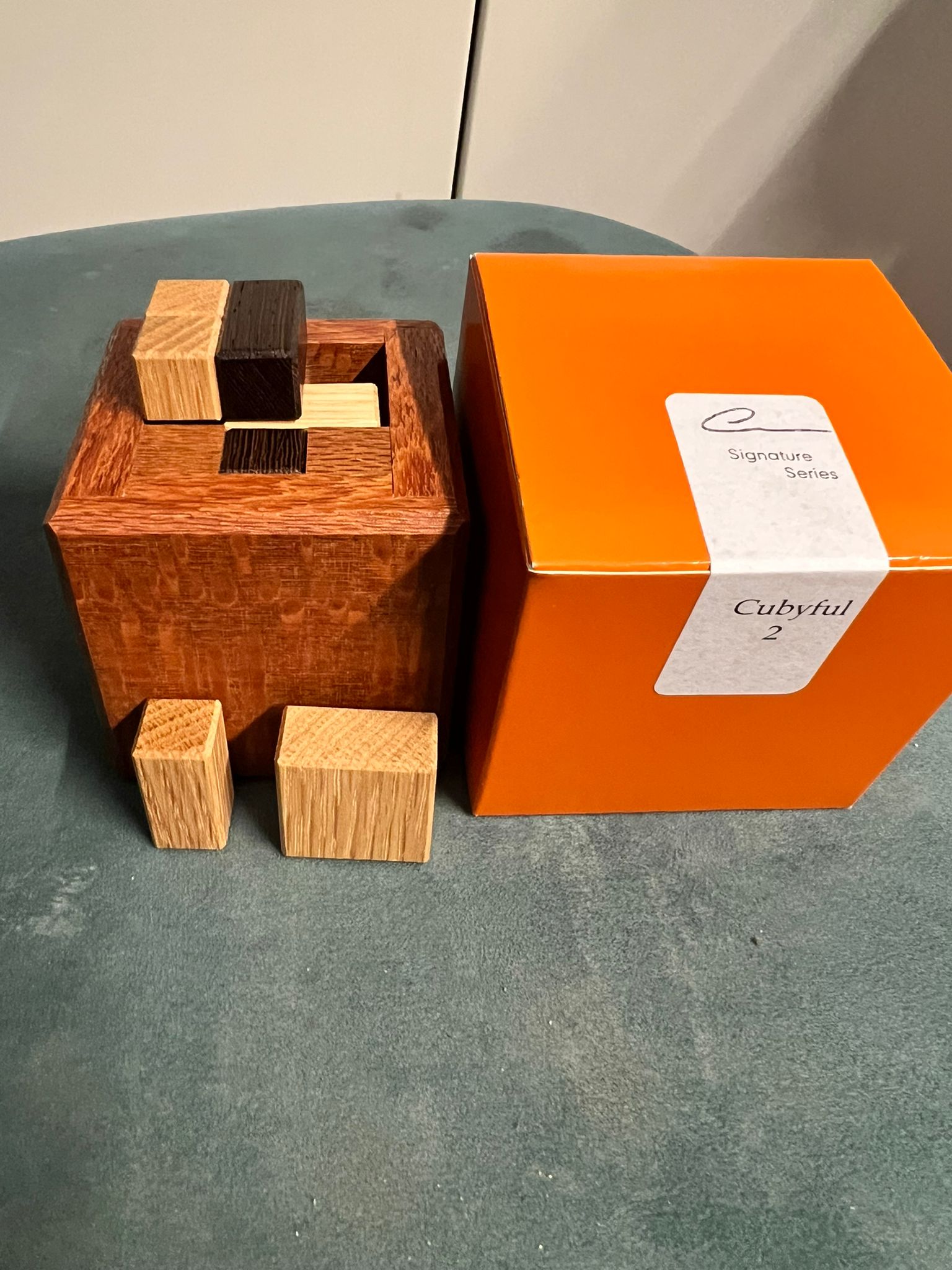 Cubyful is an interesting interlocking packing puzzle by Lucie. Seven fairly simple pieces must pack into the box...the tricky part is the captive piece which must be accounted for during assembly. With a level 1.2.6.2.2.5 solution, figuring this out is anything but simple! A fun challenge for the experienced puzzler, yet doable for a determined novice.