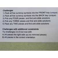 Pack all five currencies in the tray. Front and back of the tray have unique solutions. 3 additional anti-slide challenges, and more additional challenges with extra constraints