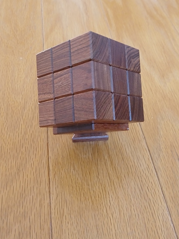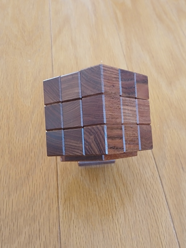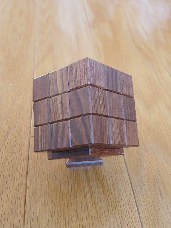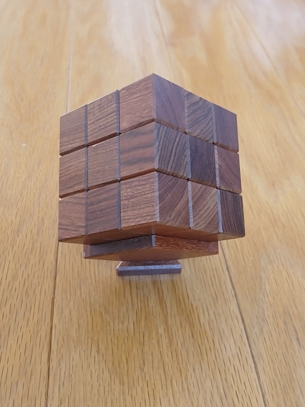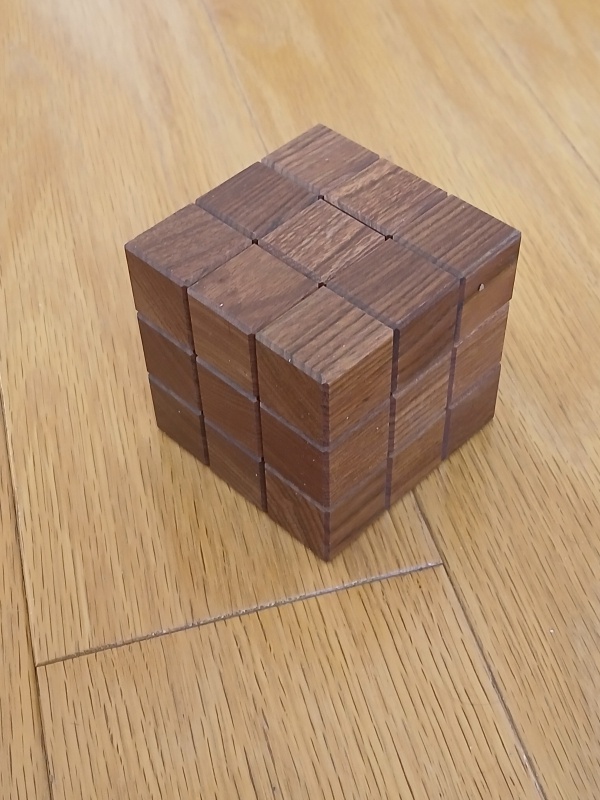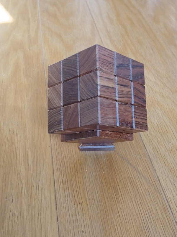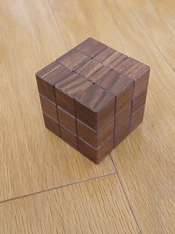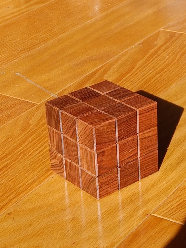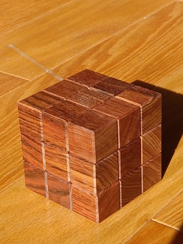 When first given this puzzle, the goal is to take it apart and then to put it back together as a cube. But this is no simple task. There are internal grooves and pins traveling these grooves to form a strange maze that you can at times see and at time wander blindly. It's not blind at all, but one has to put together scattered glimpses together into a map of the maze and then deduce how to travel through this 3d maze until escaping. And while a solver could escape with a little luck, it forces the solver to truly master the puzzle to be able to reset it properly. In fact, it's possible to reset this puzzle with one piece put back in the wrong orientation which becomes obvious to others with a good eye for wood grains. It's not a coincidence that all of the cubes of the puzzle follows the grain of the wood. It's a helpful guide for how to restore this puzzle!