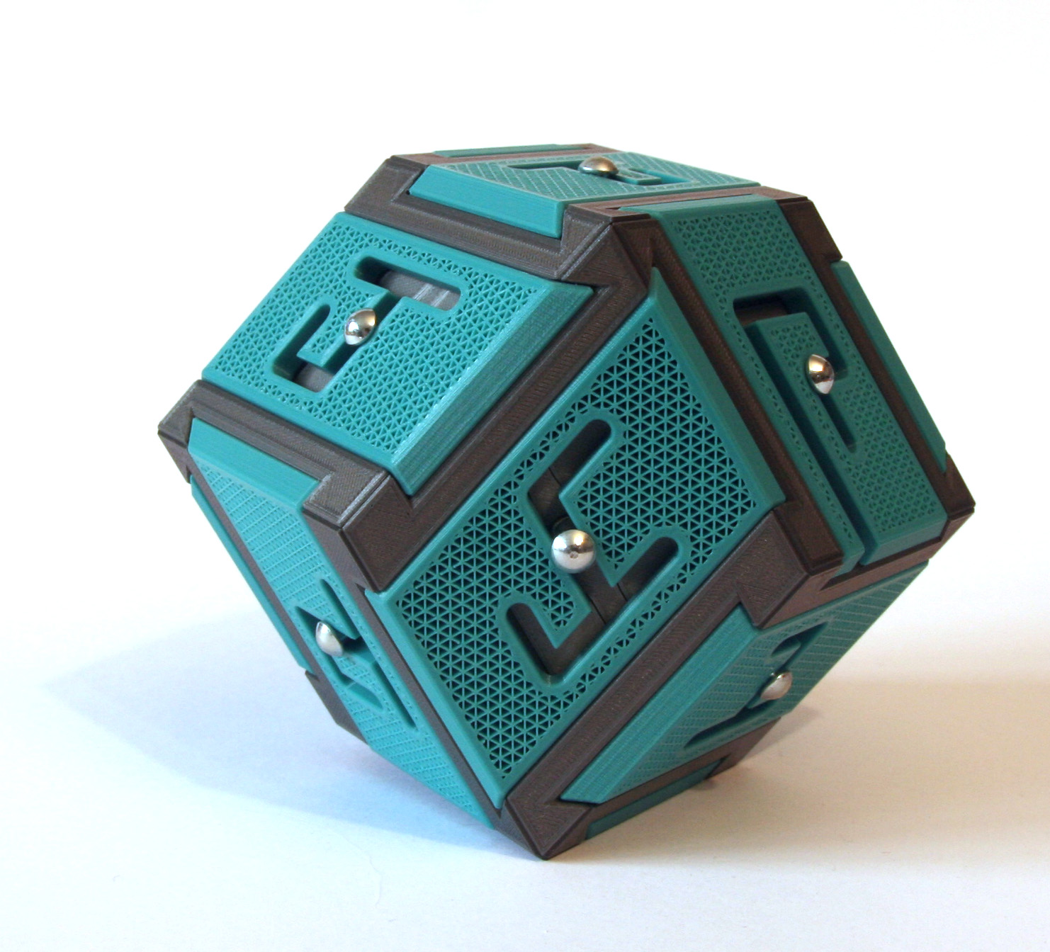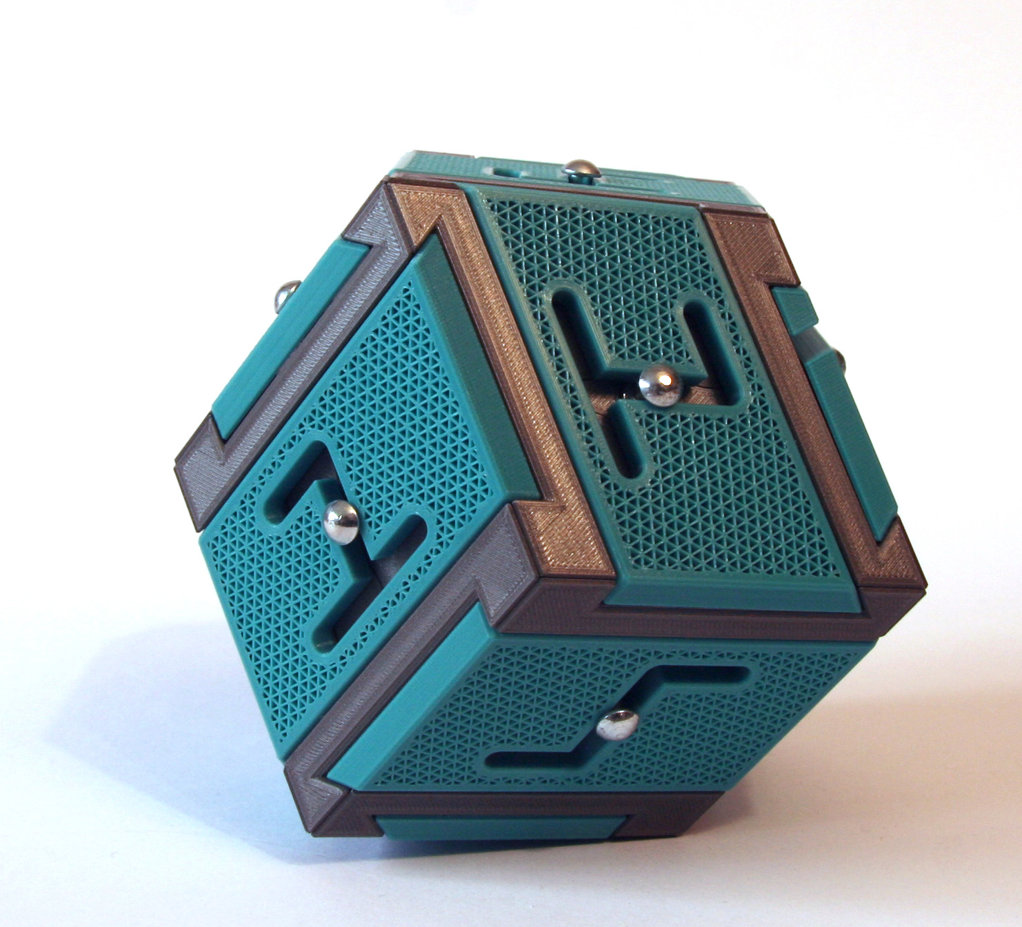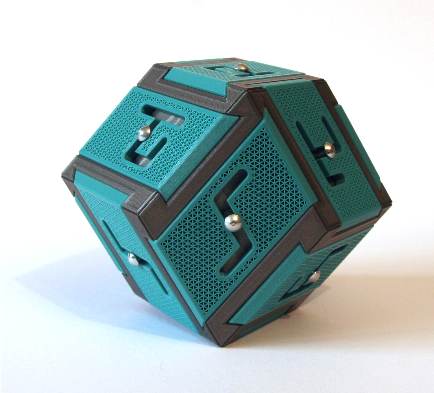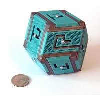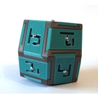 based on Kagen Sound's Maze Burr and designed using John Raush's Maze Burr analysis program. made by Stefan Trifonov ('Trifcho') of SmarTrIQ Puzzles, printed in PLA. the tolerances and tension on this are absolutely perfect: movement of all panels is made as effortless as possible without allowing for accidental 'gravity' moves as the puzzle is turned.