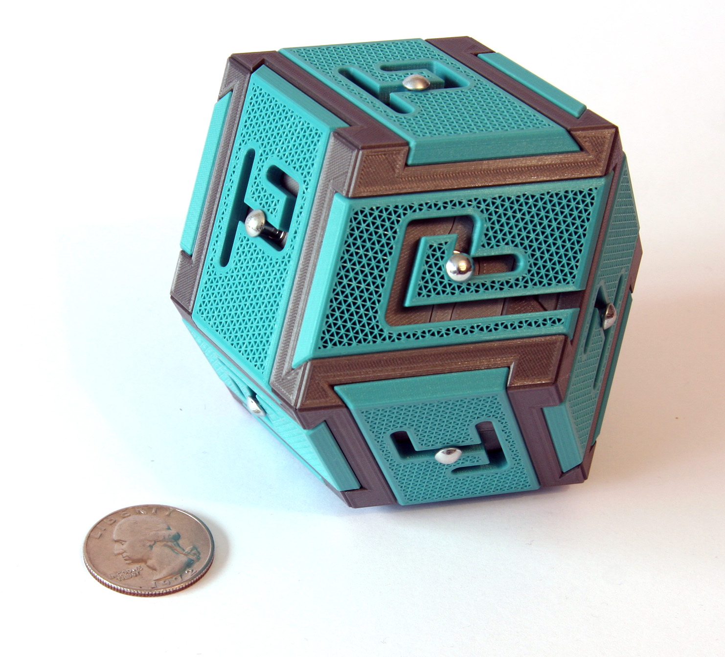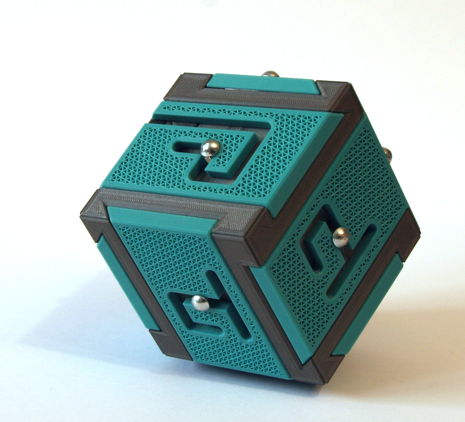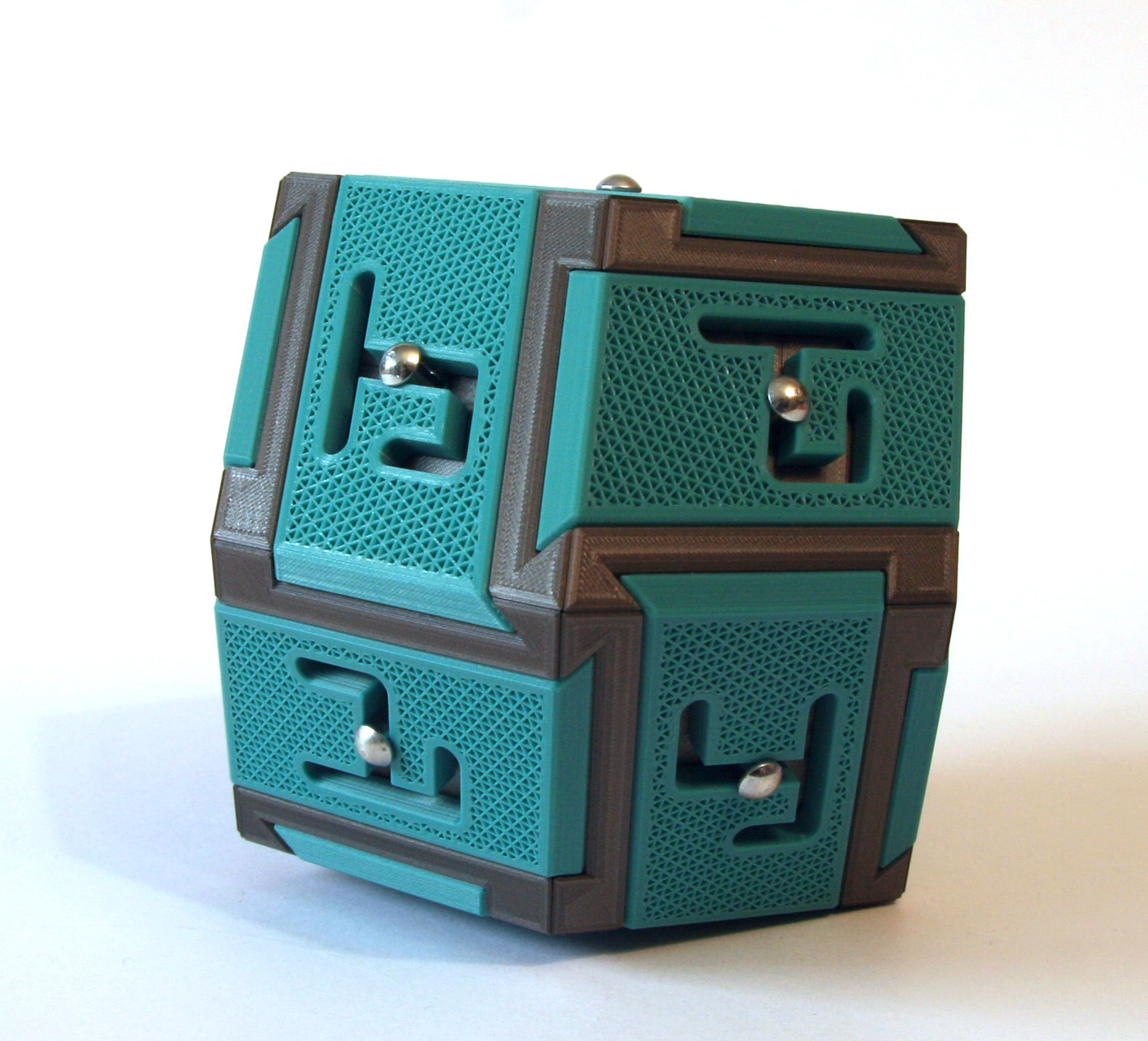 based on Kagen Sound's Maze Burr and designed using John Raush's Maze Burr analysis program. made by Stefan Trifonov ('Trifcho') of SmarTrIQ Puzzles, printed in PLA. the tolerances and tension on this are absolutely perfect: movement of all panels is made as effortless as possible without allowing for accidental 'gravity' moves as the puzzle is turned.