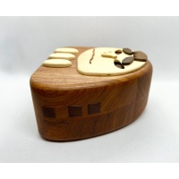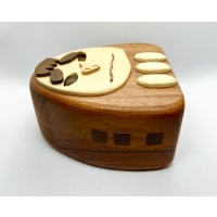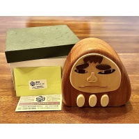 An absolutely adorable 2011 work of puzzling art, this early Karakuri Idea Contest beauty looks fantastic on a shelf.  The eyes move.  The nose moves.  The eyebrows move.  Even the three buttons at the bottom move.  But can you figure out how the box opens? All original packaging included.