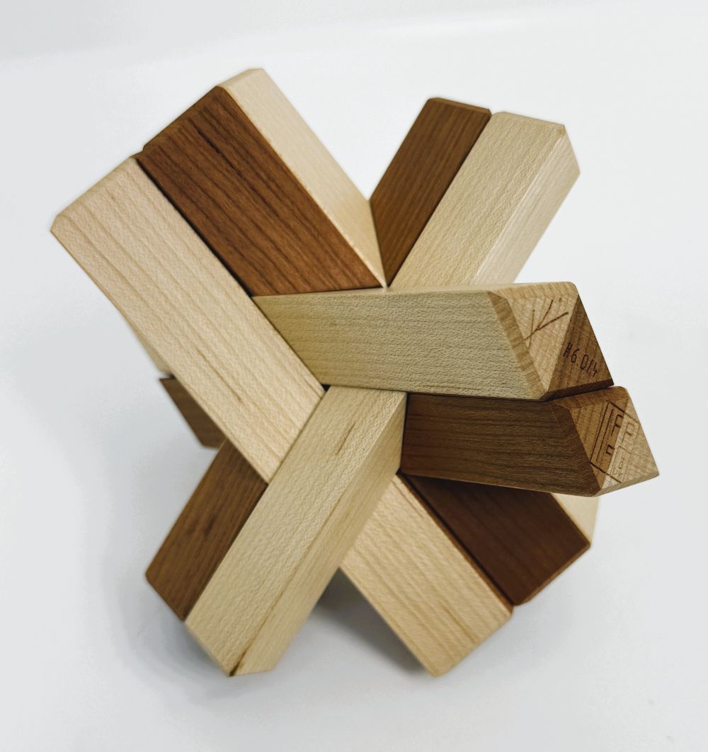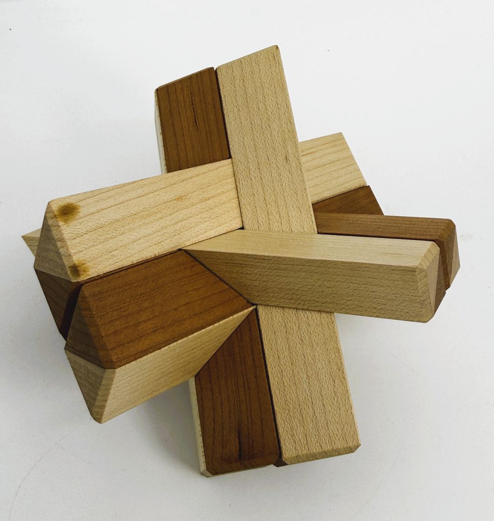 Goal: To put the six pieces together into the sort of squashed interlocking burr shape show.
