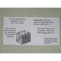 Assemble the L-shaped pieces into a 3x3x3 cube, with the common dot patters of a die.