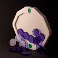 This puzzle has two different challenges. The goal is to put all pieces inside each side of the tray. There is a side with red dots and one side with green dots.