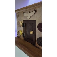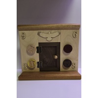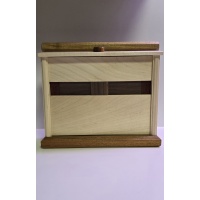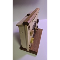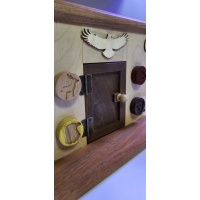 Beautifully made with a Native-American vibe. The different dials/animals have to work together to open the door. The back panel is removable with the supplied "key" so you can view the mechanisms after (or before, if you give up) solving. The handmade mechanics are just as beautiful as the outside of the puzzle as is most of Kel's work. I did not include a pic of the inside for spoiler reasons but will gladly send one upon request.