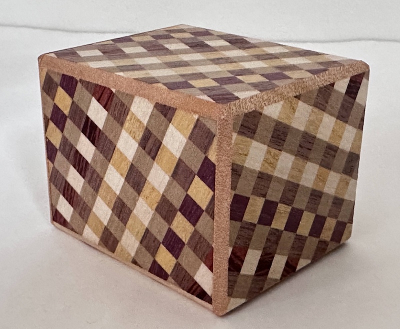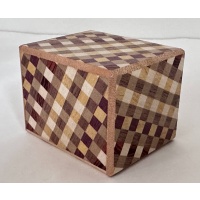 Double Puzzle Box by  Hiroyuki Oka  - Size 65 X 81 X 60 mm    This work was designed as a Christmas present for 2010. This work is Nesting Secret Box.. The inner box's mechanism is traditional. And there is a moving bar called, "Kannuki".  Materials - Walnut, Camphor Tree, Magnolia, Agaths, etc.