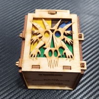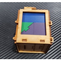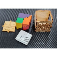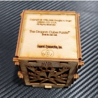 When I first found this little puzzle I wasn't sure. I mean it is in a laser wood cut box... made back in somewhere between 98 and 2006... okayyy... not a lot of people were doing that yet... rare already. And to make a box for a puzzle... that is cool.. the graphics, the cut outs, and the fun impression is inviting. But what about the puzzle... is it just another put this cube together and done puzzle? Because that would be a very short return on investment... nope.. the instructions in the little box tell you there are more than a dozen shapes that will keep you busy trying to reproduce... and then when you are done... BAMB!... back into this now ingenious little box...