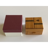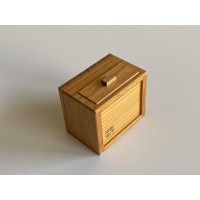 The exterior of the puzzle measures approximately 99 x 91 x 69 mm and has a small storage space of 68 x 58 x 28 mm. Crafted in Keyaki(Zelkova), Magnolia, Ancient Oak and Acrylic board.