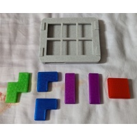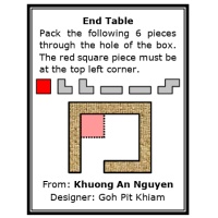 Objective: Pack the following six pieces into the box using a 2-unit wide hole at the bottom left of the box. The red square piece must be placed at the top left corner of the box as shown by the dotted outline.