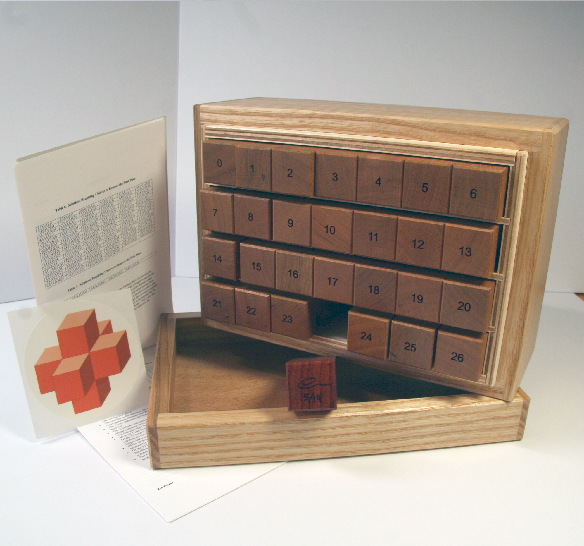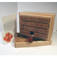 The box itself is quite special; the lid lifts off to reveal precise, ordered rows of burr sticks. What's missing are the instructions, hidden in a concealed compartment and protected by a puzzle box mechanism. You must solve the puzzle box before beginning work on the burr sets. This puzzle offers hundreds of hours of puzzling value!