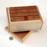The Penultimate Burr Set is something I've wanted to make for a very long time. I love burr puzzles, and the versitility and value of burr sets is unmatched. This set of 27 numbered pieces combines to make hundreds of puzzles, from fairly simple solid assemblies to extremely difficult higher level assemblies. Never before offered in six unit length, a new analysis of the set was performed by Ken Irvine and revealed many problems which were unachievable with the traditional eight unit length pieces.