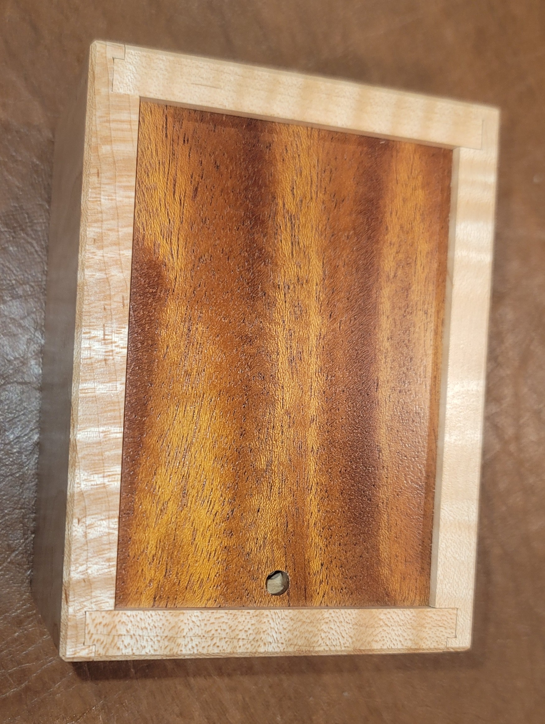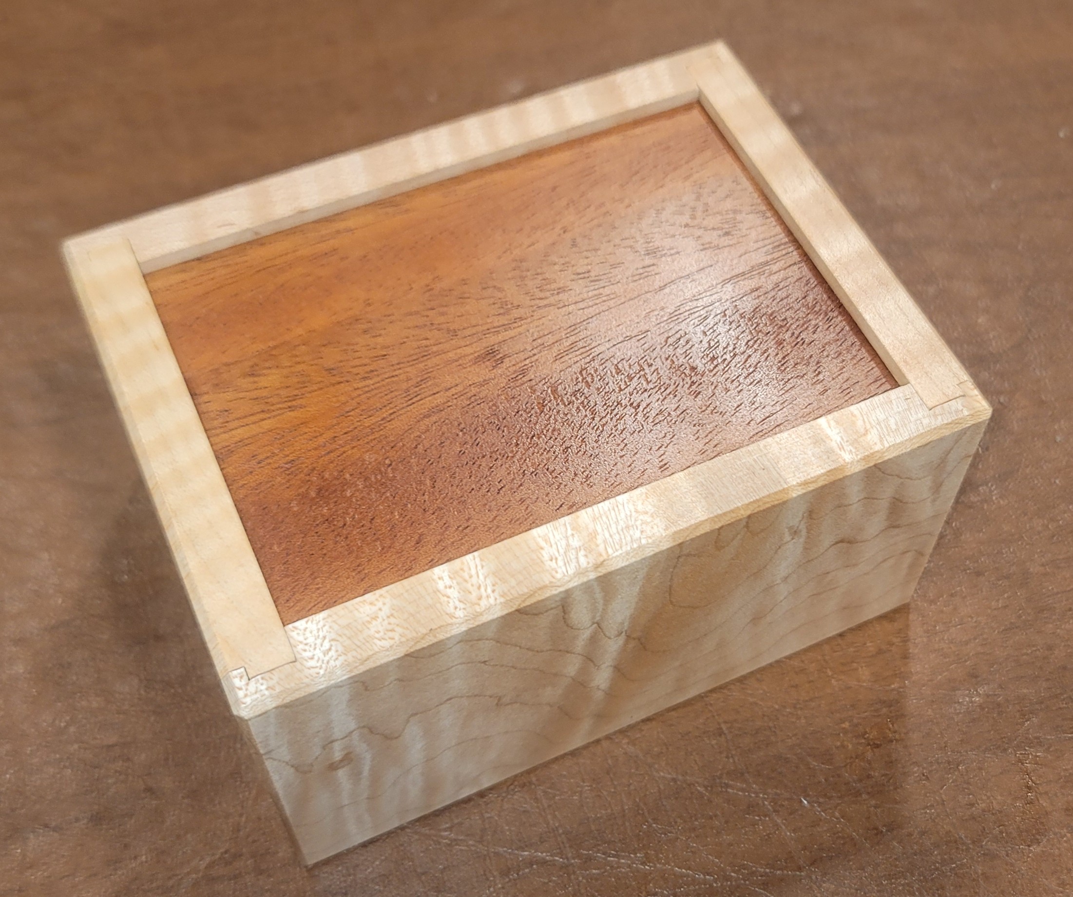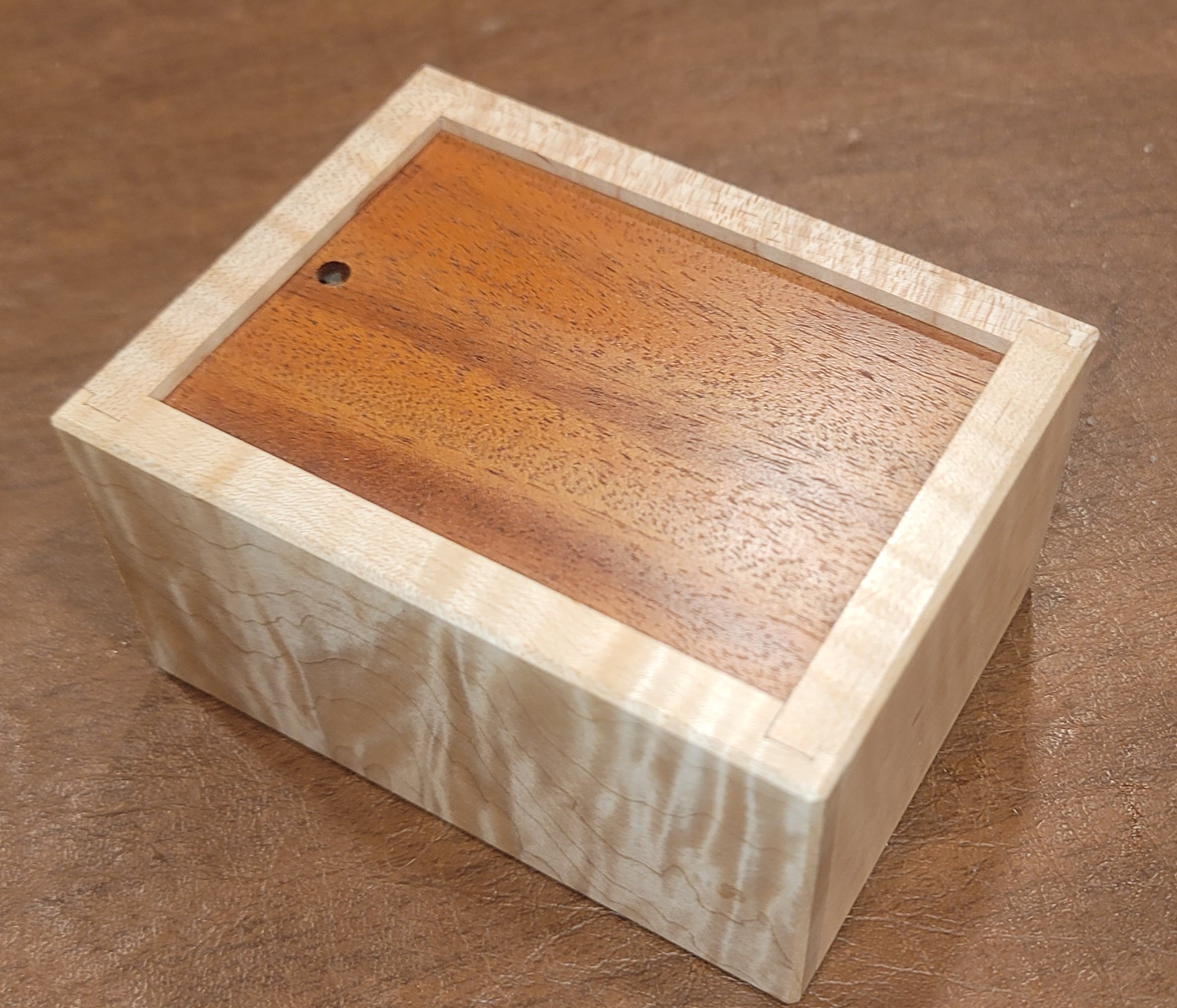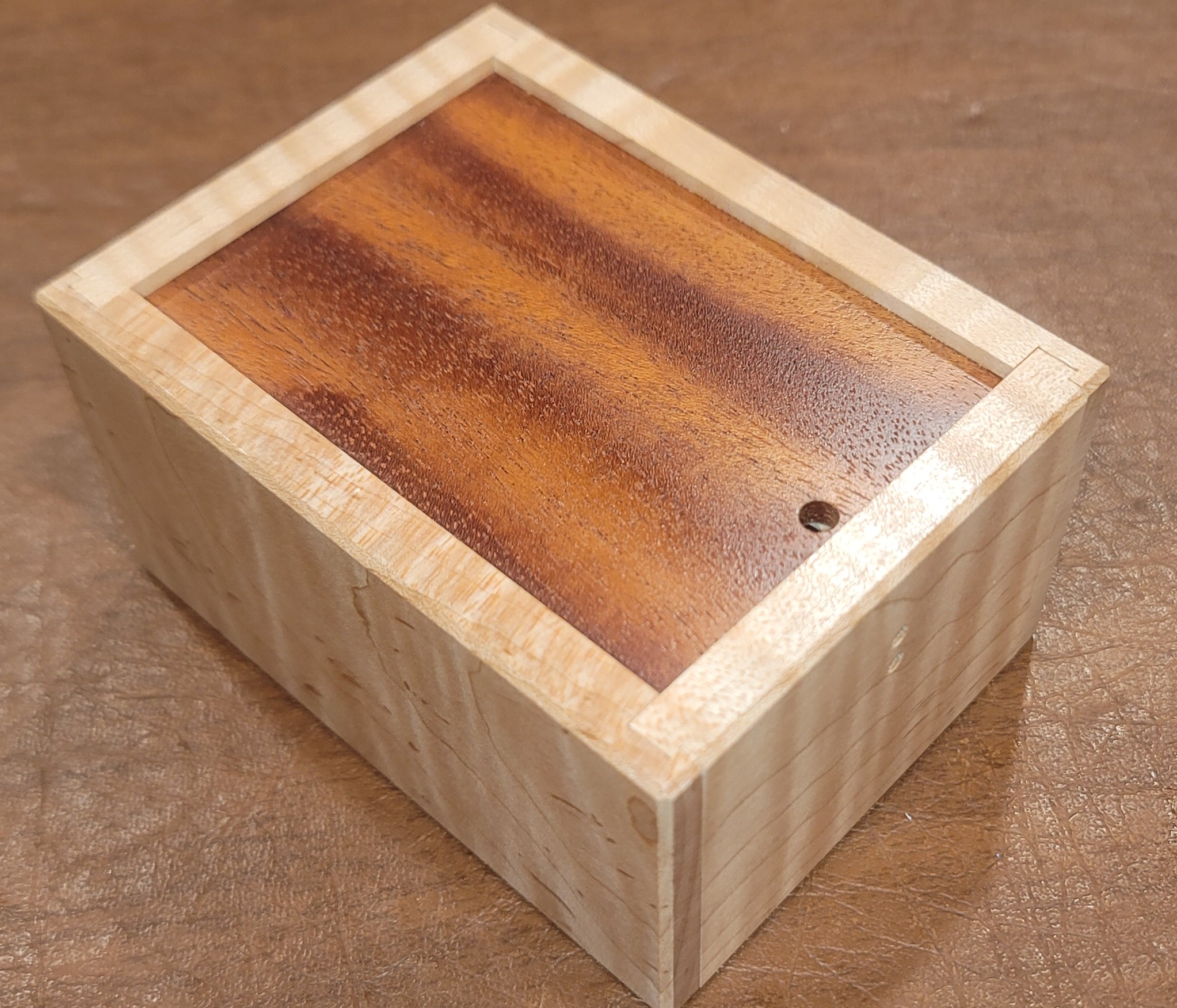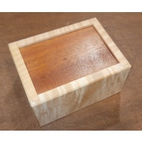 This is a fun solve, about medium in difficulty, and one that rewards progressive solving and manipulative experimentation. Construction is beautifully realized with a Curly maple box and several exotic wood options for the lid."