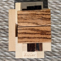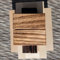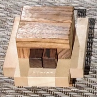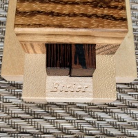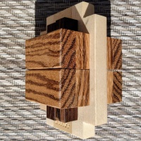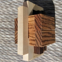 “Etrier is a variant on the idea of Pontoon and Aqueduc with a single rectangular plate and a couple of H shaped plates at 90º to it. This version has the H’s held in place in the centre with some beautiful rings made from Zebrawood. The first few moves are quite constrained but after that there are quite a few options some of the options seem to include the possibility of rotating the pieces. This clearly does not lead towards a solution and it requires a little discipline to keep trying linear moves. Etrier is significantly tougher than Pontoon requiring 30 moves to remove the first piece. Once the 2 H shapes are removed then it is obvious that the rings can only be removed after a rotation. Very clever and stunning for the shelf.”