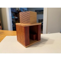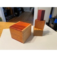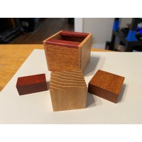 “I was very pleased to receive the Puzzlers' Award and Jury 1st Prize at the Nob Yoshigahara Puzzle Design Competition 2020. EUKLID FOR KIDS with its simple box and only three simple blocks was meant to have an unconventional solution. As children do, the interplay between the blocks and the box was meant to be curiously discovered. In doing so, I had left out a feature of the blocks in order to make the solution easier to see. In the revised edition, I have incorporated this feature. This second edition is for real discoverers. The parts made of padauk and acacia have been swapped to distinguish between the two editions.”