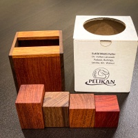 “Shortly before his passing, Eric Fuller had offered me a copy of HARUN made of metal and wood. I had initially declined because I don’t like this combination of materials. Eric prevailed, as always, and a little gem of exotic woods and brass was released. A final design by Eric based on an idea of mine. Shortly before that, I’d wanted to amuse him with FERMAT MEETS FULLER. Here, a cube of six triangles has to be packed into my typical box. And now EUKLID MEETS FULLER. The EUKLID series is already full of surprises and stories, so I’m removing the restriction to a trilogy and dedicating this new design to Eric Fuller. In order not to get lost in possibilities, I gave myself some guidelines a cube-shaped box and one of the pieces should be a cube; it should be very challenging, and the solution should contain new sentences. My homage to the founder of CUBIC DISSECTION will end up with only four pieces. A very nice result after the many considerations and once again a wonderfully pleasant cooperation with Pelikan. The design in dark woods is a nod to EUKLID FOR KIDS as a thank you for Eric’s playful, idiosyncratic, and handcrafted approach in and for his community, despite all the sadness his untimely death has brought. I wish you an unforgettable AHA moment and a great joy in life by playing with EUKLID MEETS FULLER.”