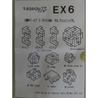 EX6 is a wooden 6-piece assembly puzzle. There are 2 copies of 3 different pieces.