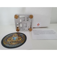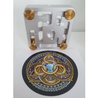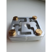 "To solve FastMaze 1, you must navigate the four brass pins through the stacked aluminum mazes until it comes apart into the seven component pieces. Since all elements interact, this is more difficult than it might seem! Making space to allow one move will block others. Finding a solution will take time as you learn the interactions and limitations of each maze piece. FastMaze 1 has a level 52.24.28.10.9.14 solution, with 137 moves required for complete disassembly. Rotations are allowed and sometimes necessary, but no guarantee they will help! The brass pins unscrew for an easy reset using the included instructions should you get hopelessly lost. No force is necessary at any time.