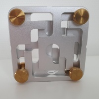 FastMaze 1 is precision crafted from machined aluminum and solid brass. The puzzle does not show any laser cutting marks as cheaper metal puzzles often do. Each piece was custom milled, and the attention to detail is apparent. Every maze edge is micro-chamfered for a smooth feel and easy movement. The plates are finished with fine sandblasting, similar to high-end electronic goods, and are clear anodized which makes them scratch and tarnish resistant. The tight tolerances guarantee smooth movement and make it a joy to pick up and play."