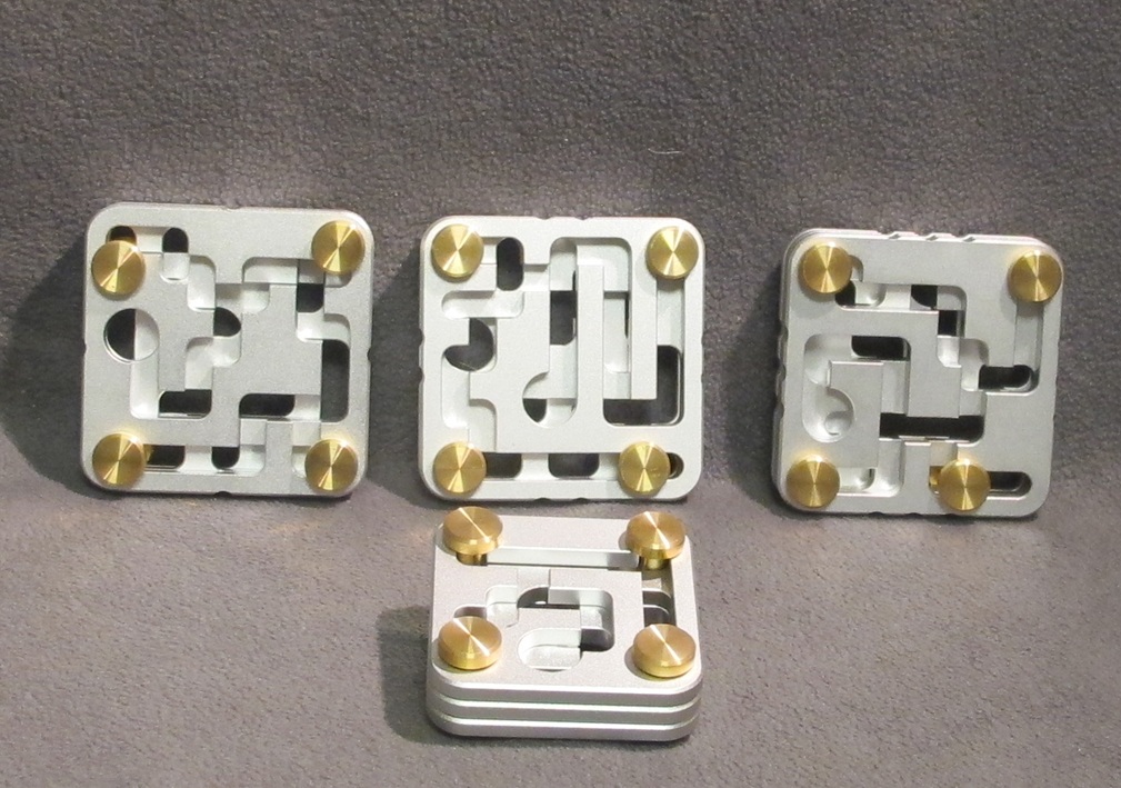 A lot of all four FastMaze puzzles designed by Dan Fast and made in solid aluminium and brass by CubicDissection!