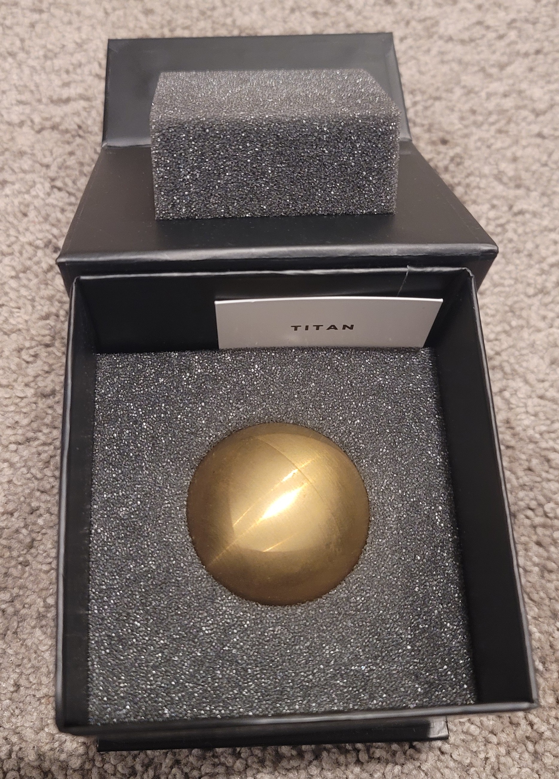 Machined from solid brass, Titan measures 50mm in diameter, and weighs 515g.