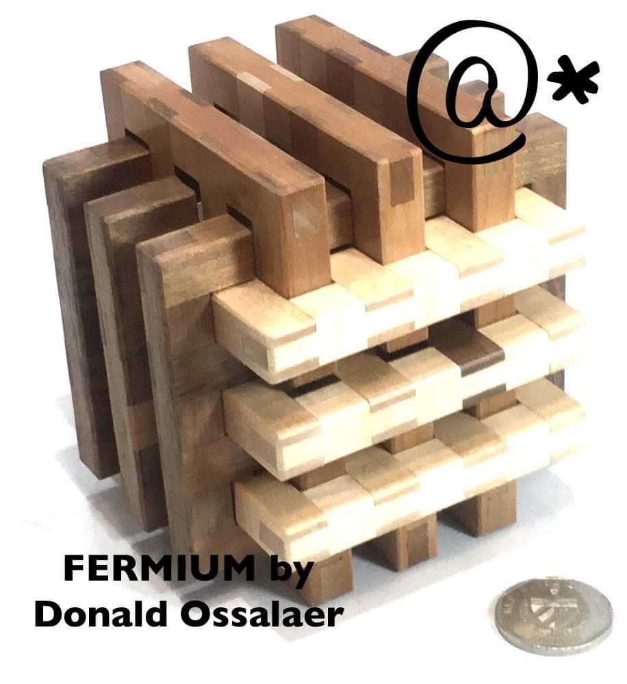 "For newcomers to this type of puzzles I do not advise to start with the Fermium. Start with Natrium, then move up to Frans de Vreugd's Torture ... once you know that one and can disassemble and assemble it without the solution you're probably ready for the Xenon and once you know your way around the Xenon you can try my new Fermium as the basic principles of the last two are not entirely but quite the same." -Donald Osselaer