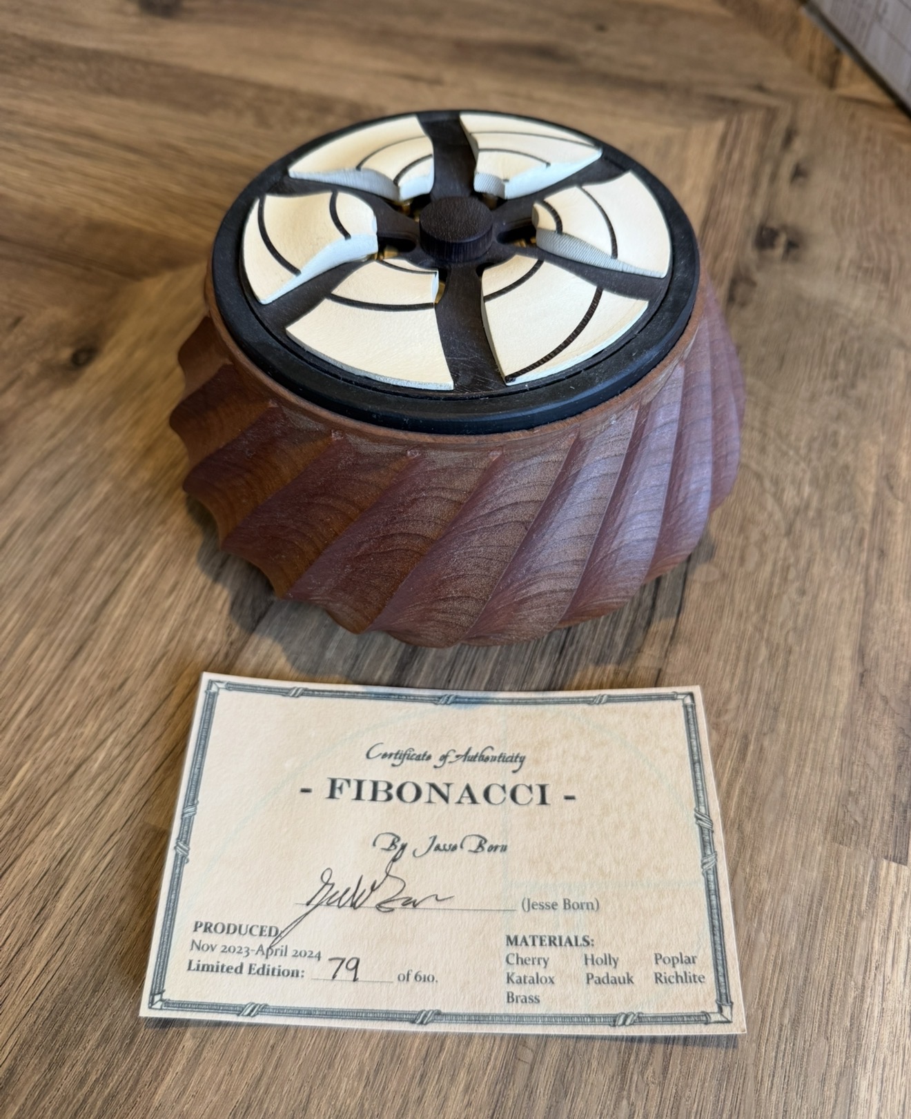 The Fibonacci puzzle is based on the Fibonacci sequence found in nature. The goal of this puzzle is to open the box. I uncovered a satisfying coincidence in nature that made the basis for the main Fibonacci mechanism. When I figured out a puzzle like this could exist I knew I would eventually have to make it, and I'm very glad I did. This puzzle works very similar to the Pi puzzlebox I designed seven years ago although I'd like to think our execution is a little better this time around.
