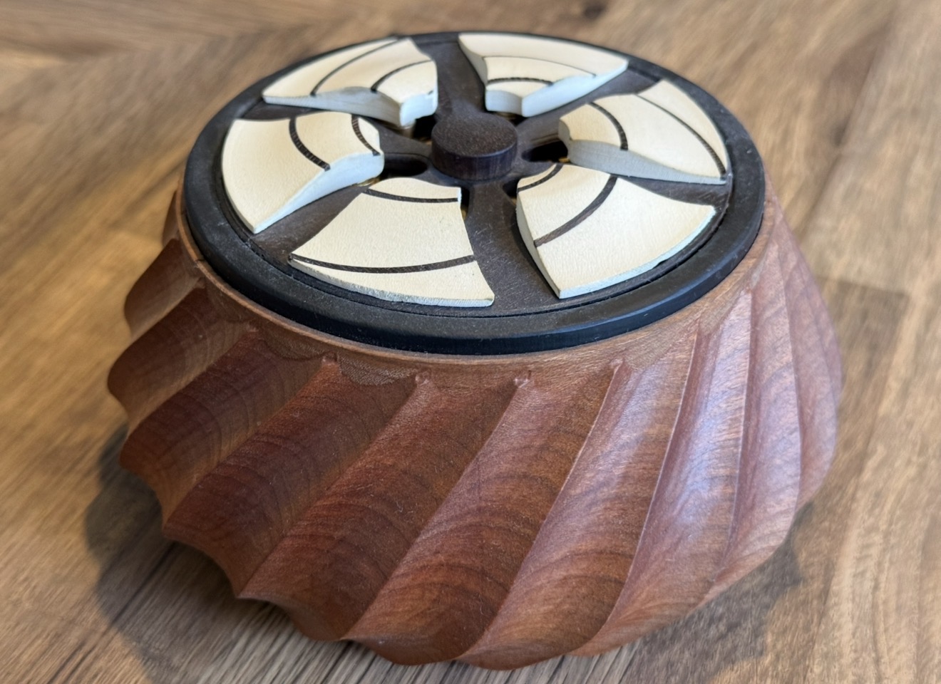 The inlay spirals on top of the puzzle are Fibonacci spirals, otherwise known as golden spirals.