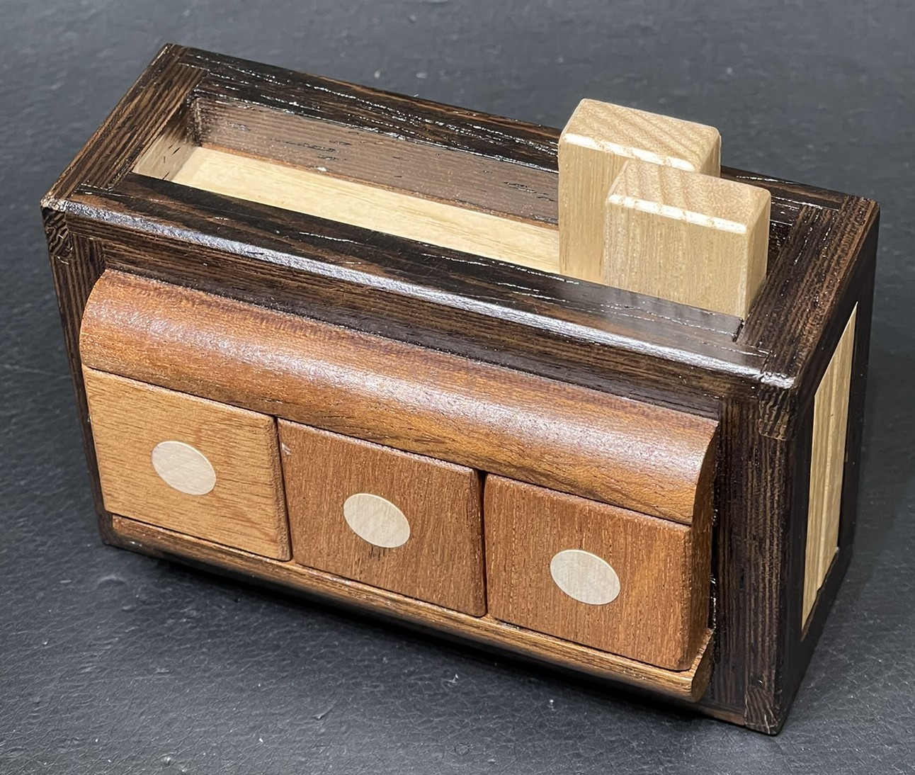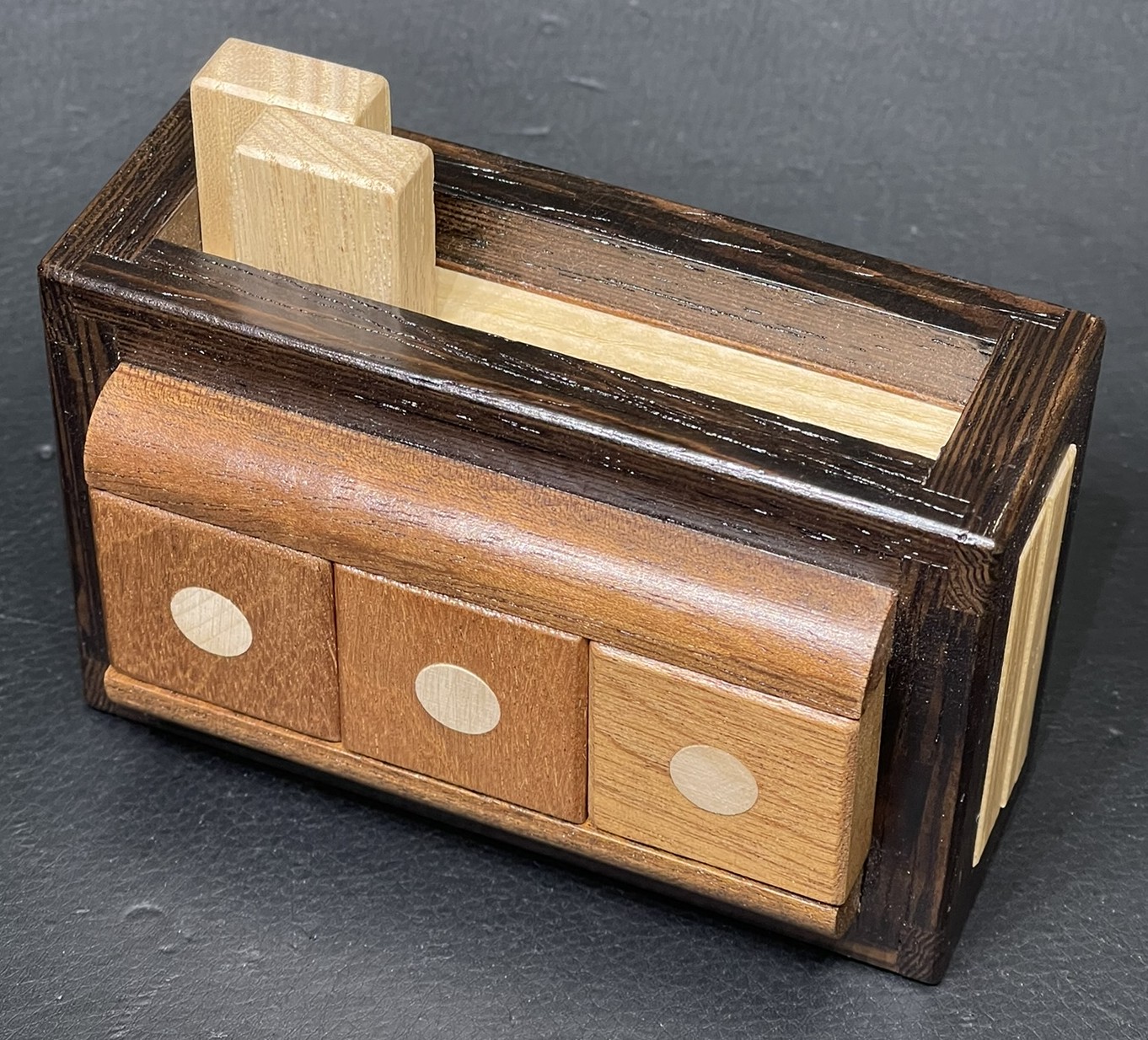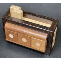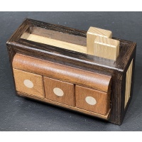 2010 Christmas Gift.  Per the Karakuri website: String Box 2010craftsmanFumio TsuburaiITEMTU-18Created11/2010Size(box body)108×75×60mmSize(storage part)*****Materialkeyaki ( zelkova ), string, etc.FacebookTwitter共有This work was designed as a Christmas present for 2010.The puzzle is located in the United States, but I will ship worldwide.Customs forms for international shipments will reflect actual payments.Payments can be made through PayPal (Friends & Family preferred).Buyer to pay sh...