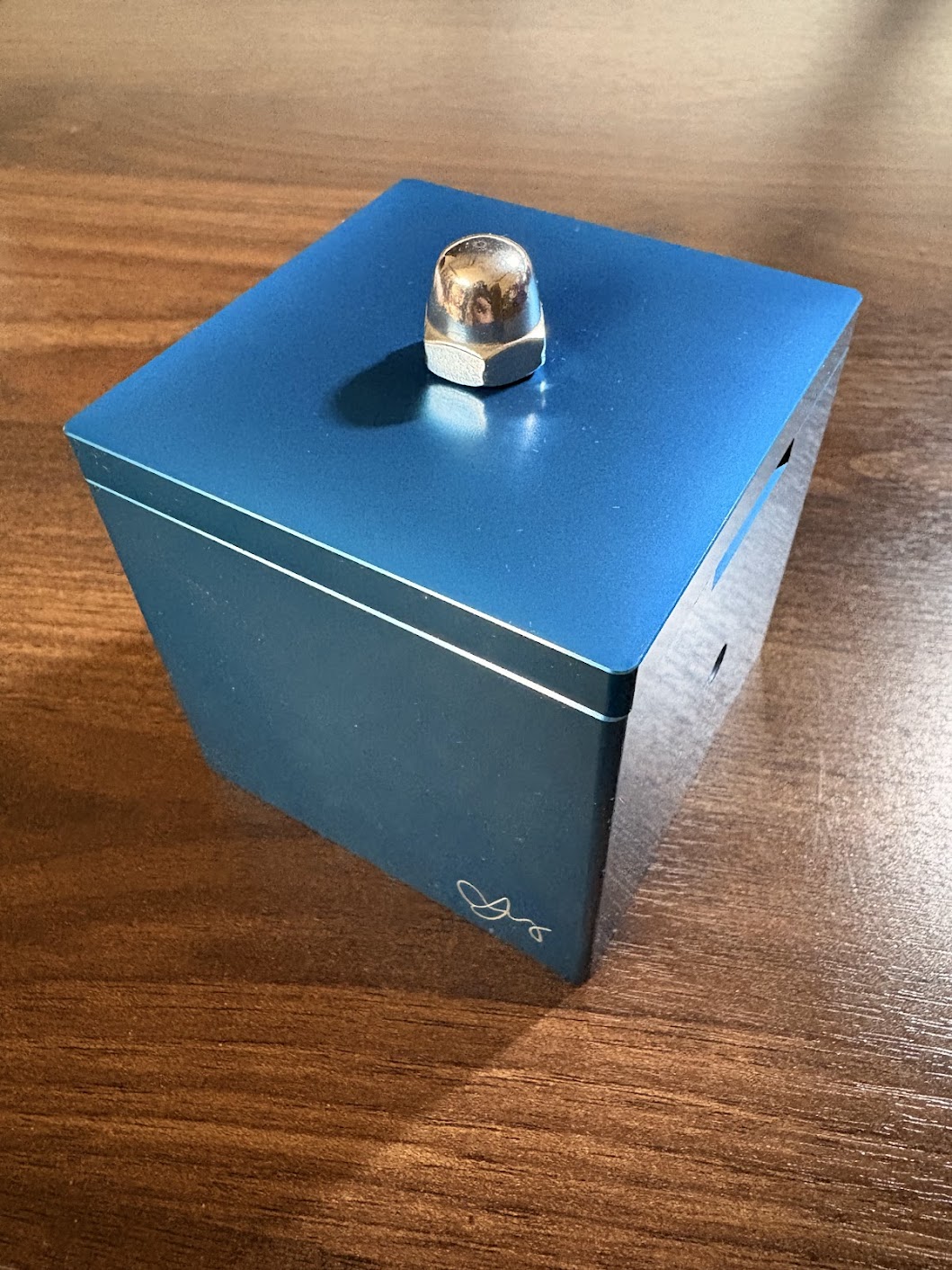 "This puzzle is a coveted sequential discovery puzzle that captivates and delights so many puzzle lovers!  It is larger and heavier than it may first appear.  The box is 70 mm x 70 mm x 70 mm and weighs 765 grams!  It is made of an attractive blue anodized aluminum that also bears the designers signature on the front of the box.  There are small holes on the sides, and one on the bottom which displays a tiny sad face when peering inside.  As with all of Wil Strijbos designs, this puzzle is extremely high quality, and is a must have for any collection."